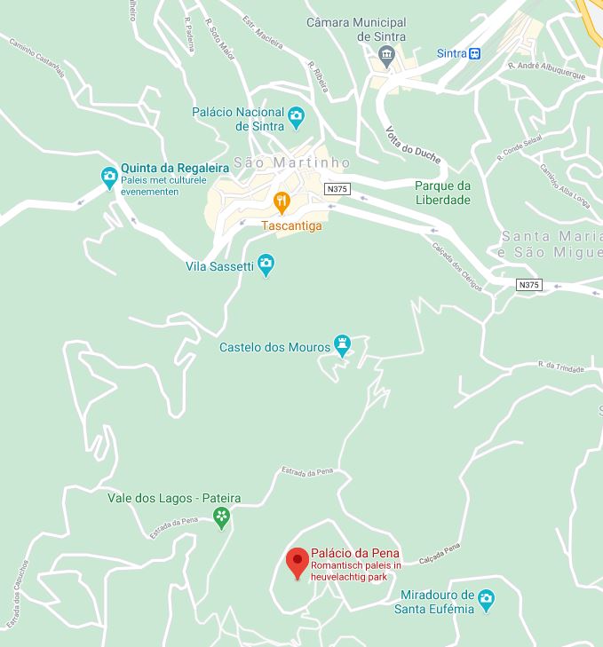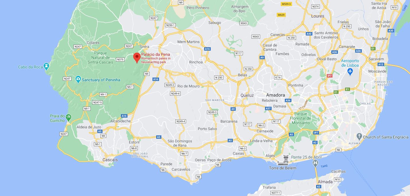 Sintra is een druk bezochte stad op zo’n 25 km ten westen van Lissabon. Zowel met de auto als met de trein is de stad op 40 minuten vanuit Lissabon te bereiken. Sintra is gekend omwille van zijn kastelen en paleizen, waarover ik verder meer vertel en toon. Hieronder krijgen jullie eerst kaarten met de situering.