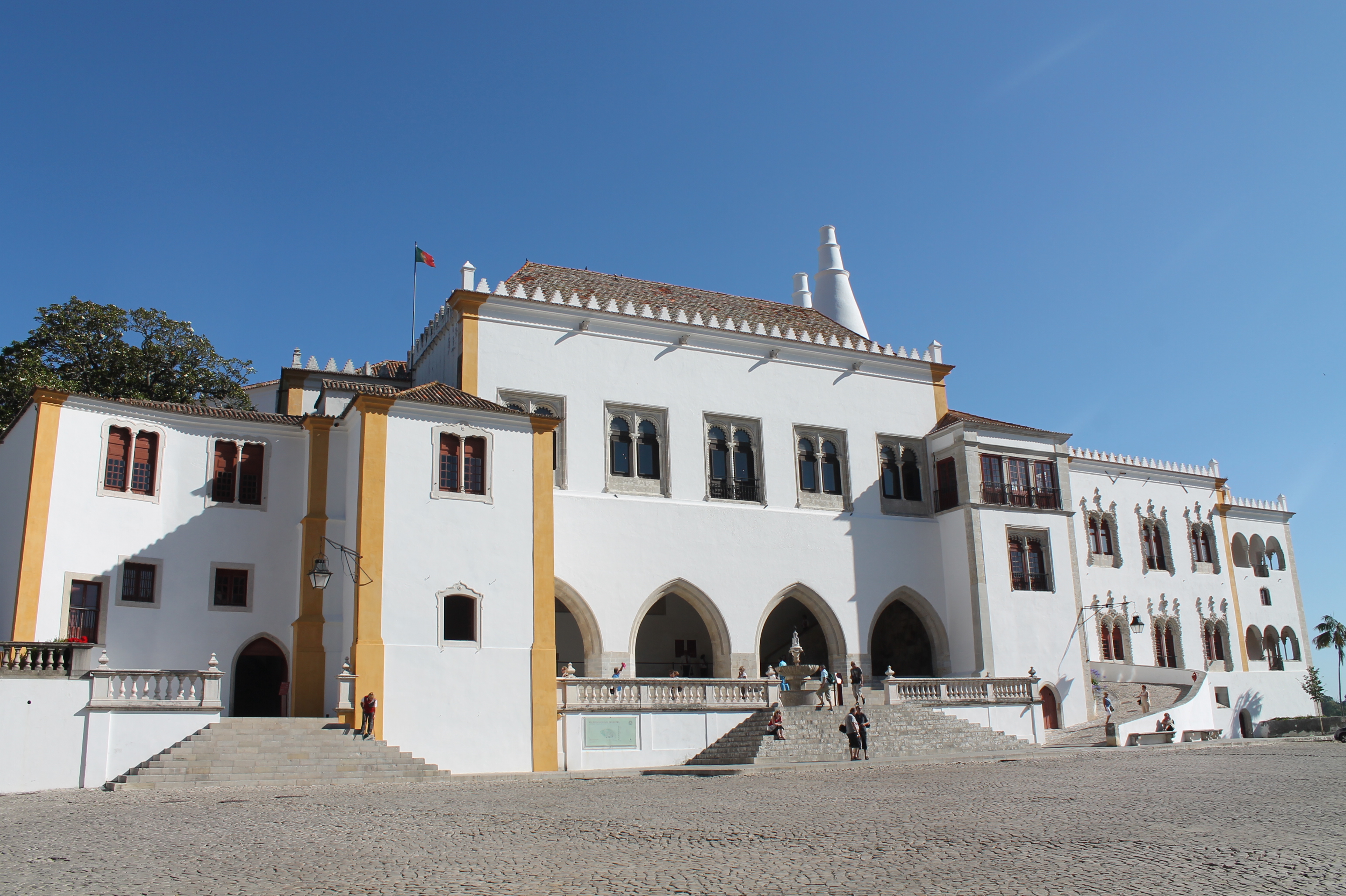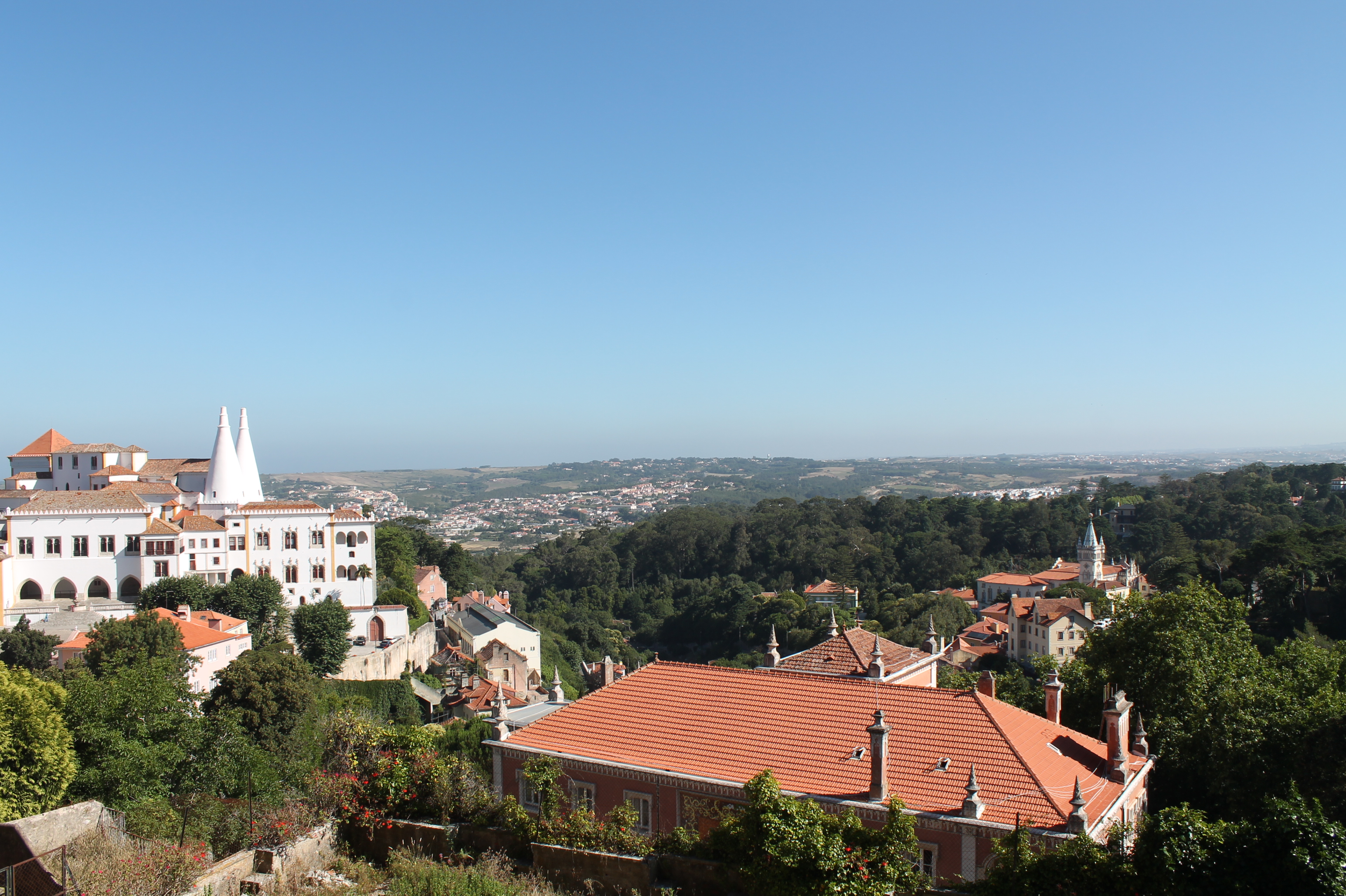 Eerst wandelden we door de kleine, historische stadskern. Het Palácio Nacional de Sintra of het Paleis van Sintra valt er te bewonderen. Van iets hoger valt het ook mooi te zien, en zo wordt het heuvelachtige landschap ook meer en meer duidelijk.