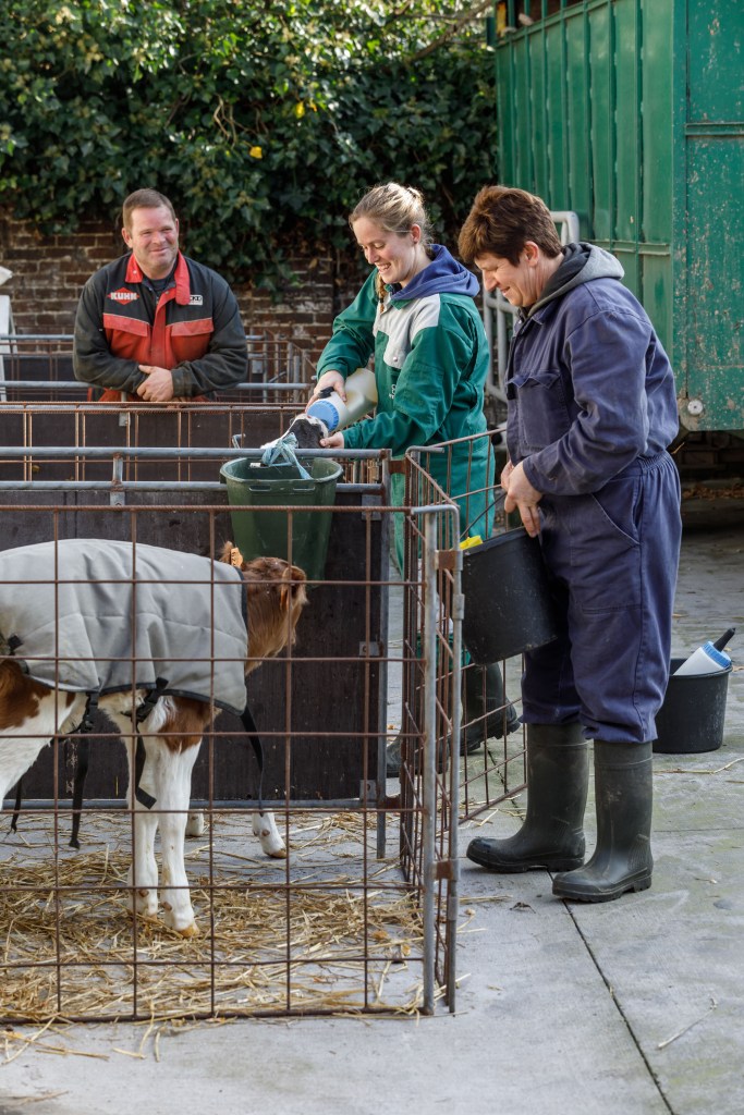 We zijn een team! Elk van ons heeft zijn eigen taken op de boerderij, bepaalde taken doen we samen… we springen bij waar nodig en ook andere familie helpt waar nodig. Teamwork makes the dream work! Moeder en ik vatten de dag rond kwart voor 6 samen aan met melken, elke dag, 7 op 7. Vader zit in het seizoen regelmatig van ’s ochtends op het veld, in de winter komt hij ook helpen bij de koeien. Zijn vaste ochtendwerken zijn ligboxen reinigen en stroboxen instrooien. Na het melken, rond 8 uur geeft moeder de kalveren melk en voeder, ik spring bij wanneer er veel kalvingen zijn. Rond 8 uur insemineer ik de tochtige koeien of voer ik enkele klauwverzorgingen uit en doe ik enkele checks op de computer. Rond kwart voor 9 ontbijten we samen en bespreken we eventueel wat en hoe voor de komende dag of week.