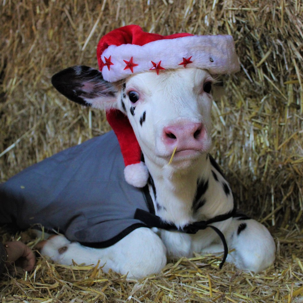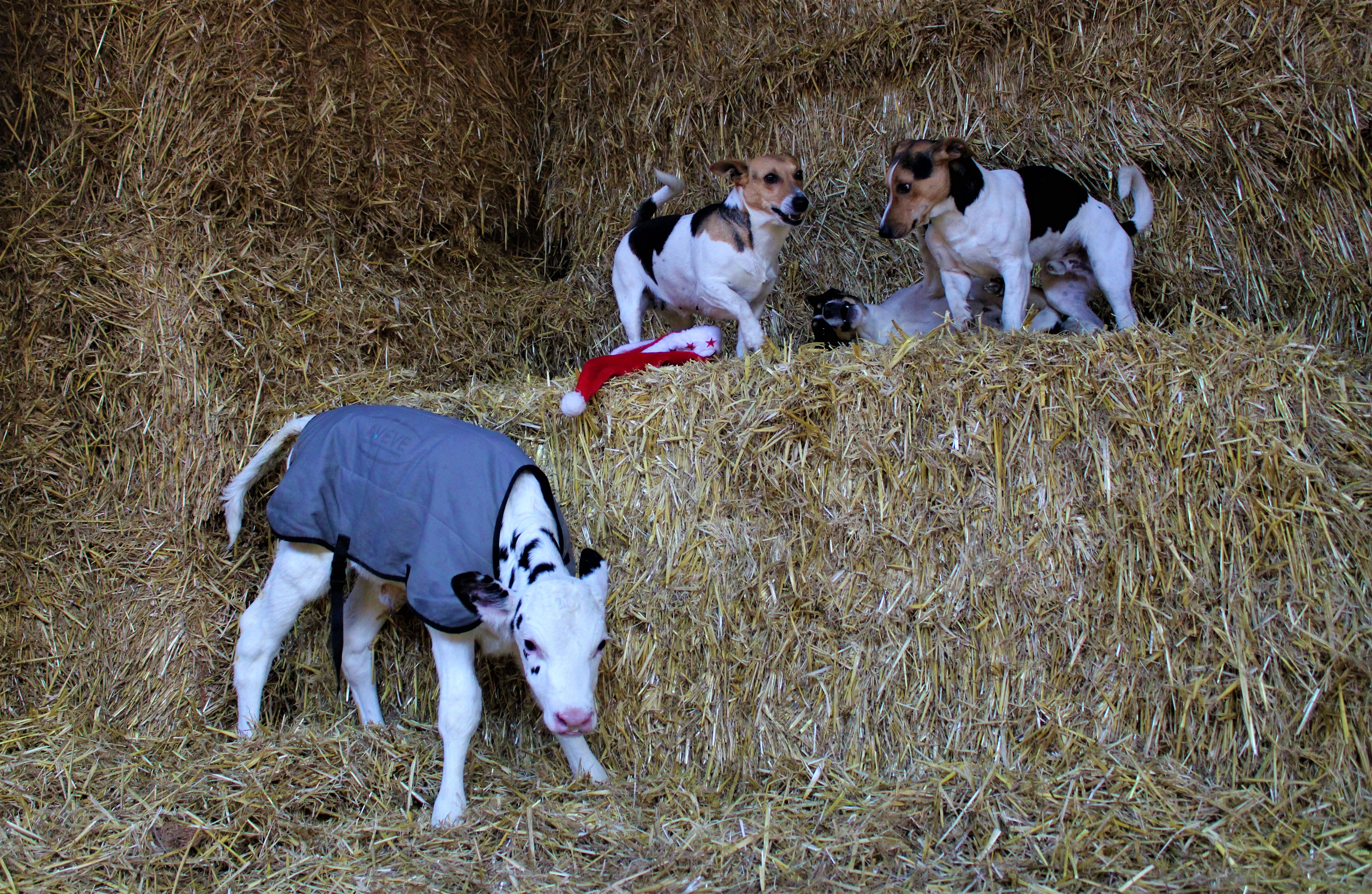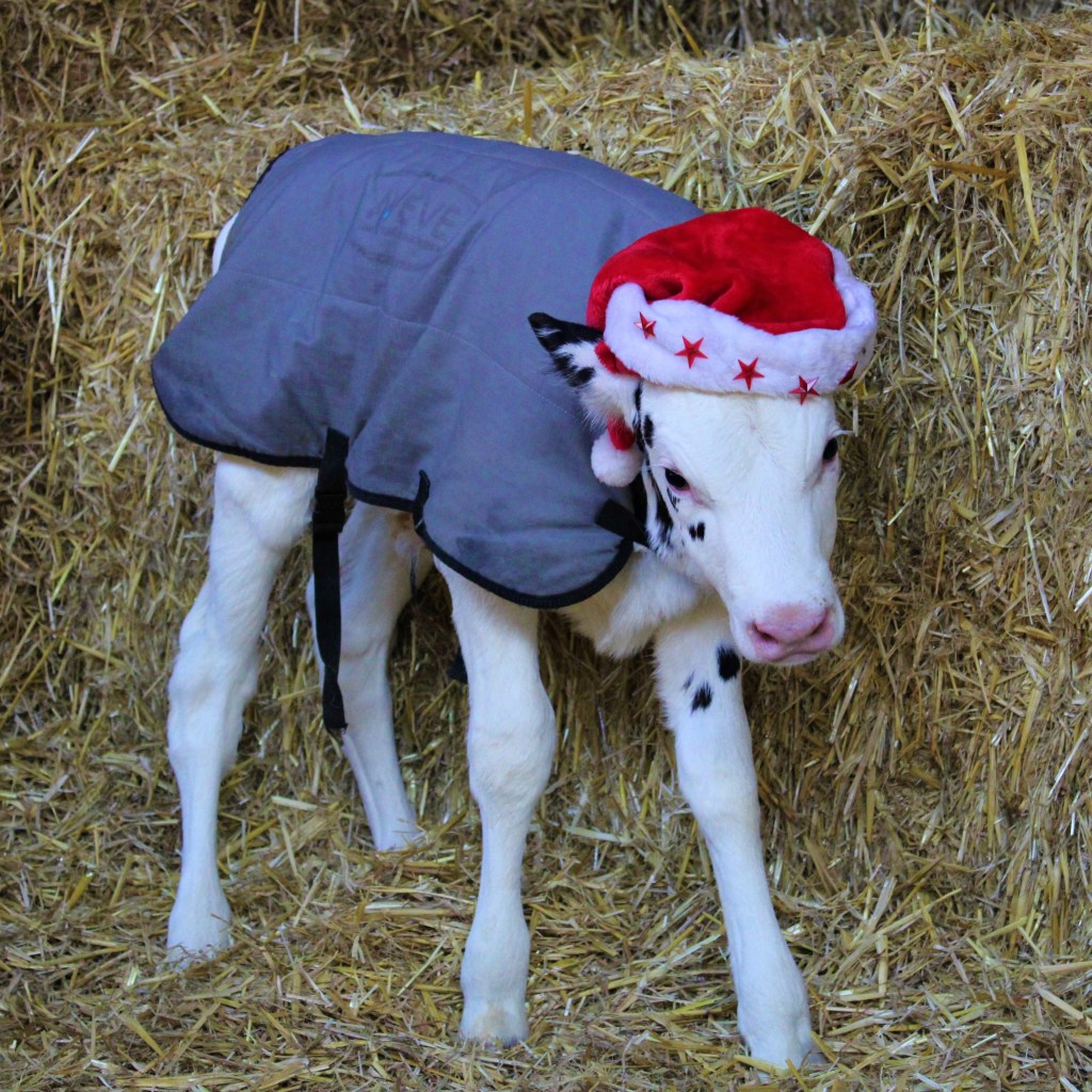 Dat doe ik met vertederende foto’s van wit kalfje Arizona. Zij werd op 7 december op de wereld gezet door koe Alaska – m’n eerste zelfstandige KI-schepsel. Beiden zijn mooi wit met zwarte stipjes! Een ideaal kalfje om een kerstmuts op te zetten en prachtige kerstfoto’s met te maken. Hiermee wens ik jullie allen vanop de boerderij een zalig kerstfeest! Maak er het beste van!