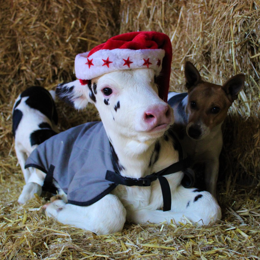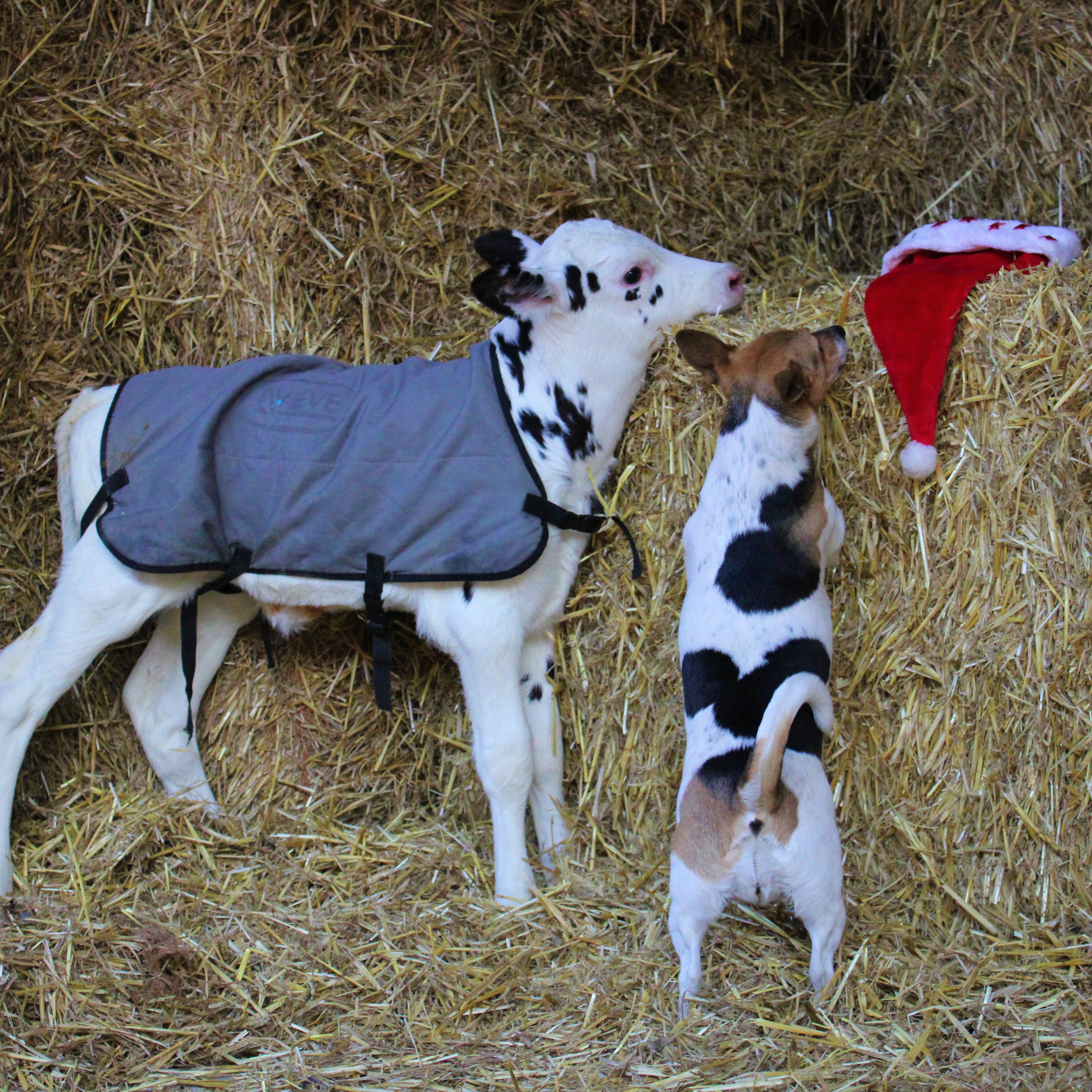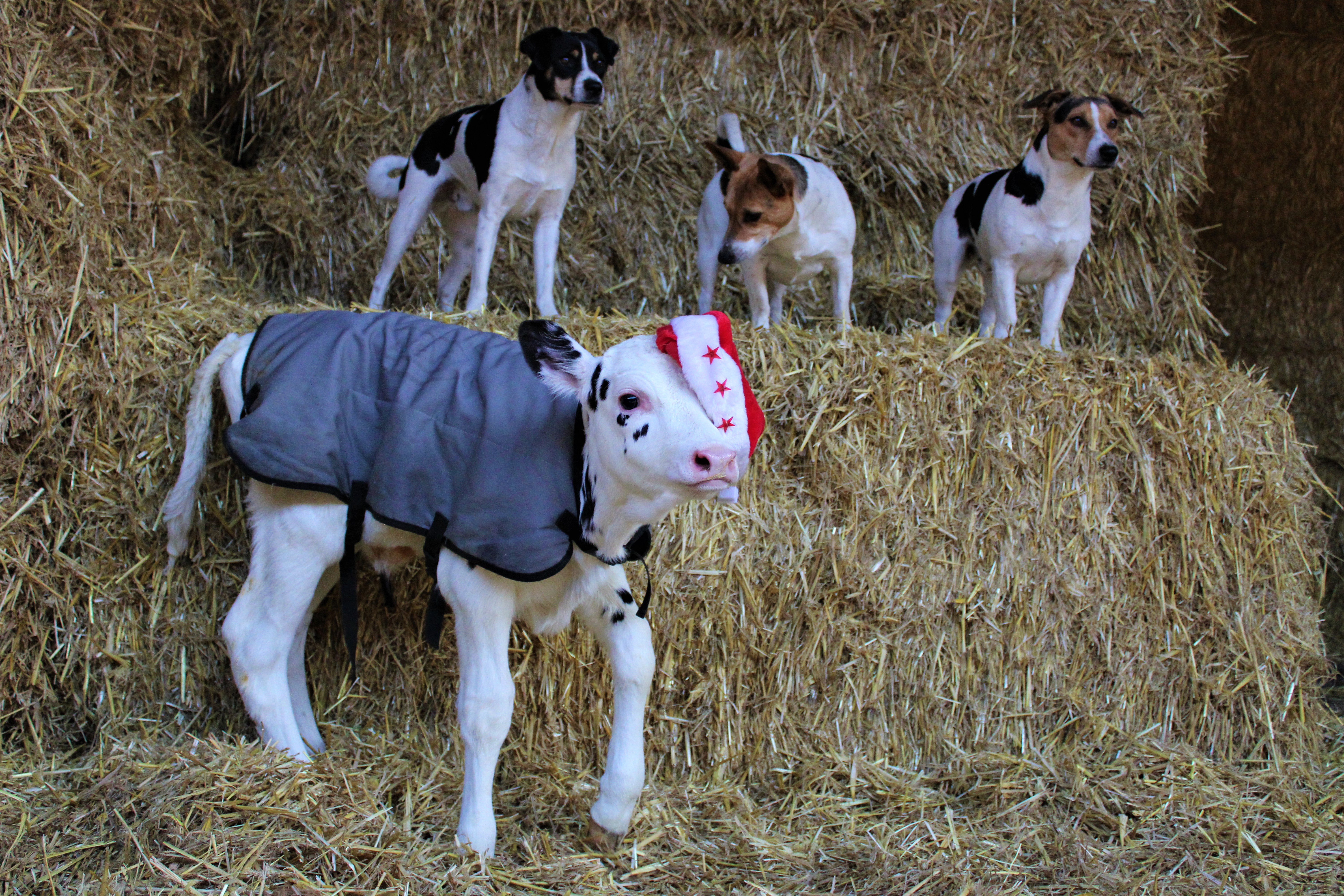 Dat doe ik met vertederende foto’s van wit kalfje Arizona. Zij werd op 7 december op de wereld gezet door koe Alaska – m’n eerste zelfstandige KI-schepsel. Beiden zijn mooi wit met zwarte stipjes! Een ideaal kalfje om een kerstmuts op te zetten en prachtige kerstfoto’s met te maken. Hiermee wens ik jullie allen vanop de boerderij een zalig kerstfeest! Maak er het beste van!