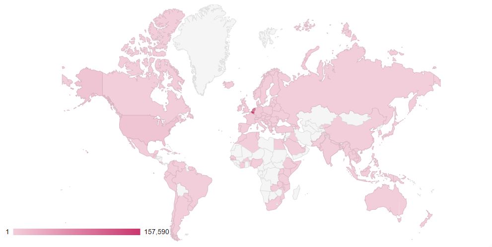 Hierboven zien jullie de totale cijfers van de afgelopen zes jaar. In totaal staat België nog duidelijk aan de leiding. Hieronder een wereldkaart waarop de landen staan ingekleurd van waaruit m’n blog al eens werd bezocht. Het zegt misschien niet veel, maar het oogt toch mooi dat m’n blog zo internationaal is! 😉