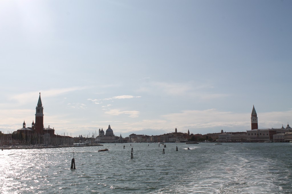 Het eiland San Giorgio Maggiori is gewoonweg prachtig te zien vanaf de Ponte della Paglia en eigenlijk ook gewoon vanaf de dijk aan het Palazzo Ducale. Het maakt het zicht nog zo veel meer idyllisch. Vooral de basiliek valt er op, net als de Basiliek van San Marco vergezeld van een hoge klokkentoren. Ook vanaf de veerboot waarmee we aankwamen en vertrokken, was het eilandje prominent in beeld, zoals op de linkse foto hieronder te zien.