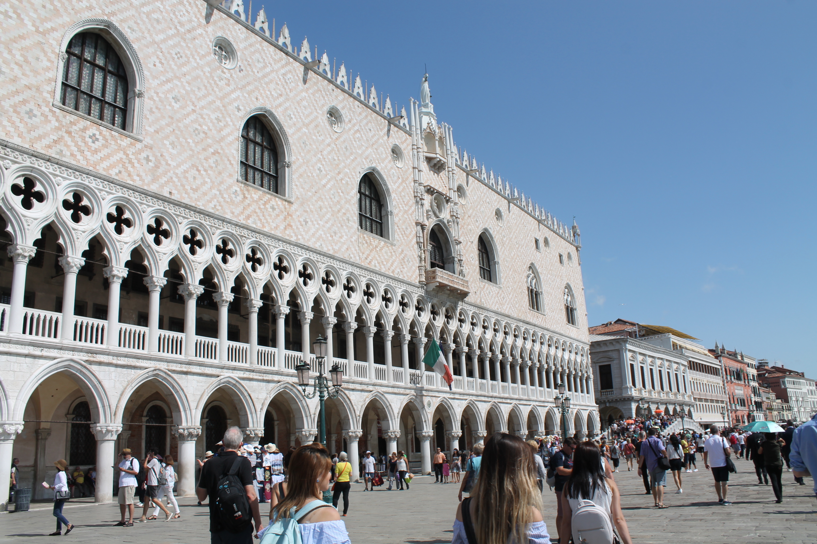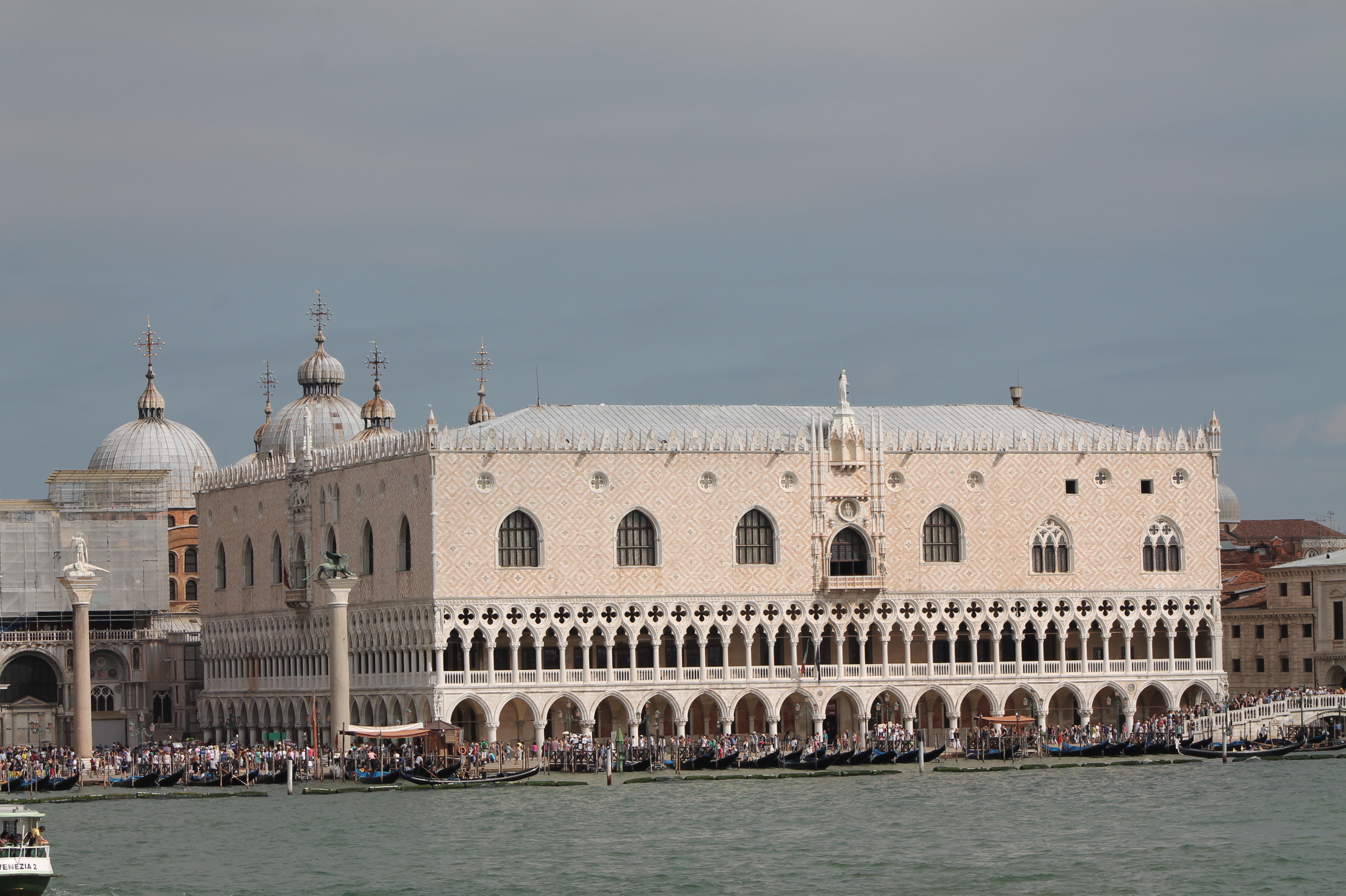 Het Palazzo Ducale of in het Nederlands het Dogepaleis bevindt zich naast de Basiliek van San Marco. Vanaf onze veerboot was het Dogepaleis nog het best te zien, of toch om op foto vast te leggen. De basiliek bevindt zich vanaf het water achter het paleis.