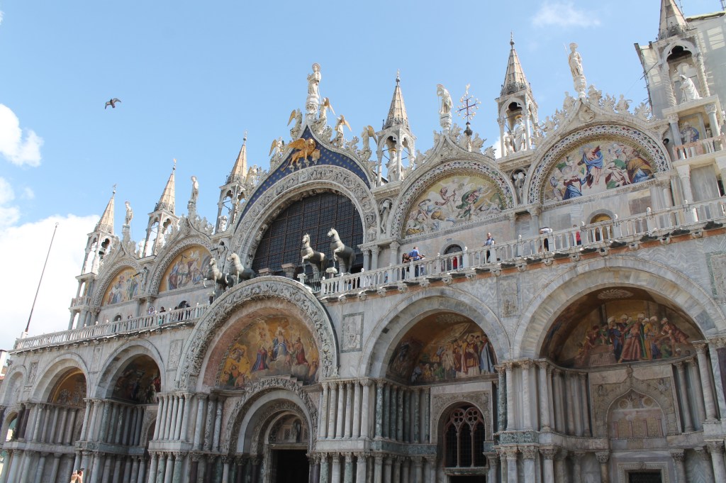 De Basilica di San Marco is een indrukwekkend bouwwerk uit 1060. Je staat werkelijk versteld van al die pracht en praal. De basiliek heeft 5 koepels en is rijkelijk versierd met allerlei bogen en torentjes. Je weet niet waar eerst gekeken.