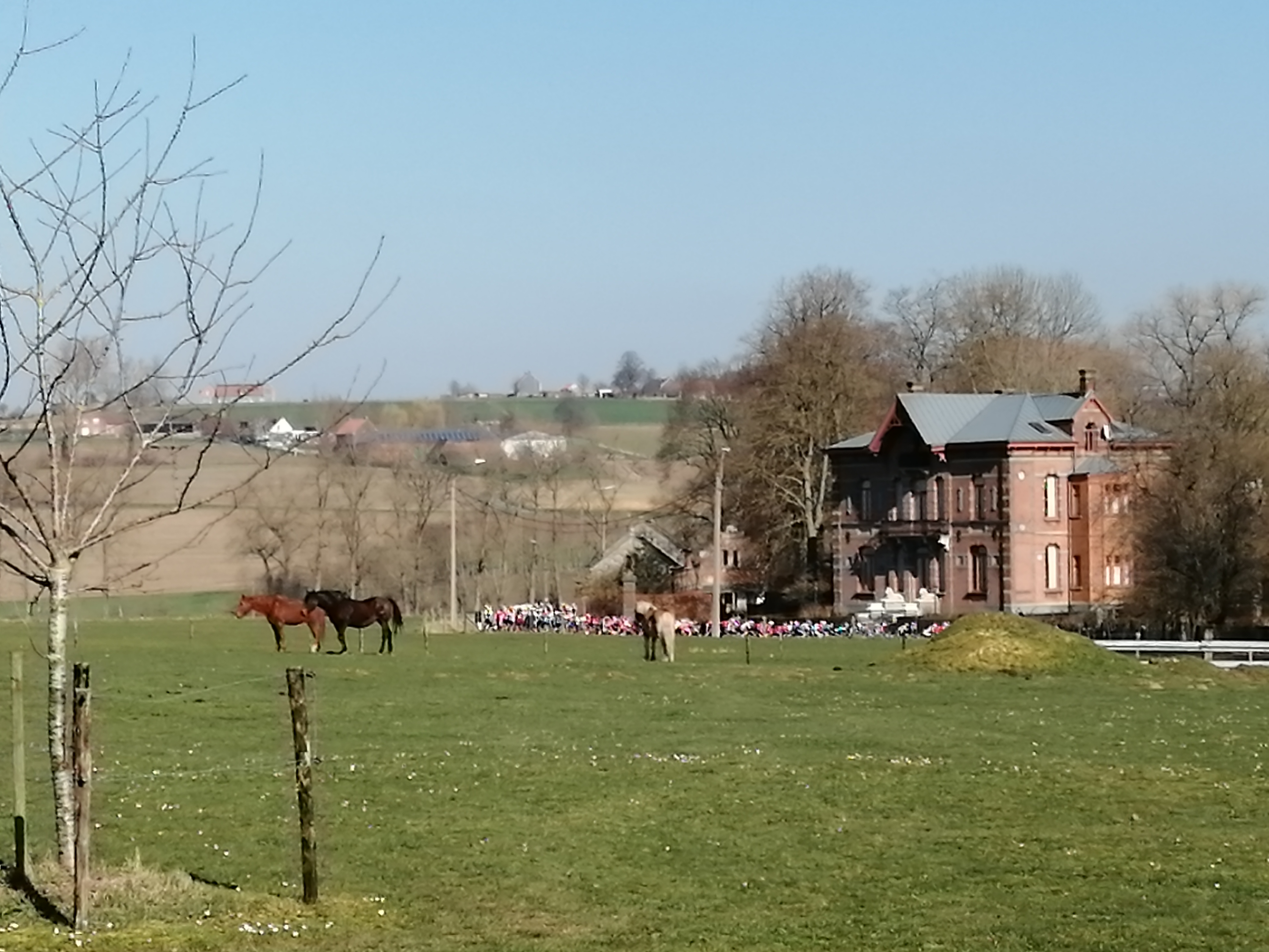 Eerst passeerde de koers Kuurne-Brussel-Kuurne aan de voorzijde van onze boerderij. De renners kwamen namelijk Berg Stene beneden, passeerden dan het kasteel – één van dé bezienswaardigheden van Schorisse – en de kerk, waarna ze van de Zottegemstraat naar de Schorissestraat reden. Wij stonden hier achteraan onze boerderij te kijken. Toen de wielrenners aan onze voeten passeerden, had ik geen tijd meer om foto’s te nemen. We juichten volop naar de renners – of toch naar degenen die we herkenden: Komaan, Mathieu! Mathieu! Alléé!