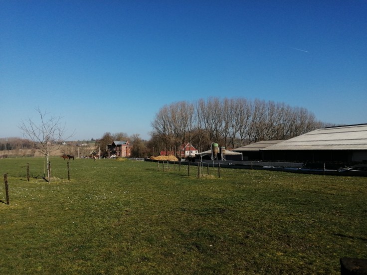 Achteraan op bovenstaande foto zie je onze John Deere trekker staan met de drijfmest injector. Inderdaad, ook de tijd van mest uitrijden, is er intussen terug, al is het op de meeste weiden en velden nog wachten tot het droog genoeg is.