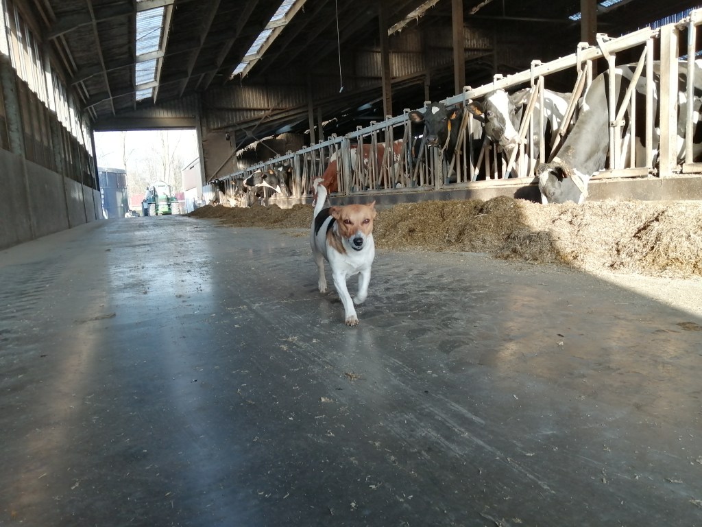 Het was prachtig weer, de zon scheen de stal mooi binnen toen de poort – hier achter mij – open stond! Ook de windzeilen gingen al voor een groot deel naar beneden. Genieten! Zowel voor ons als voor de koeien uiteraard! Ook onze hond Tisha zag dat het goed was!