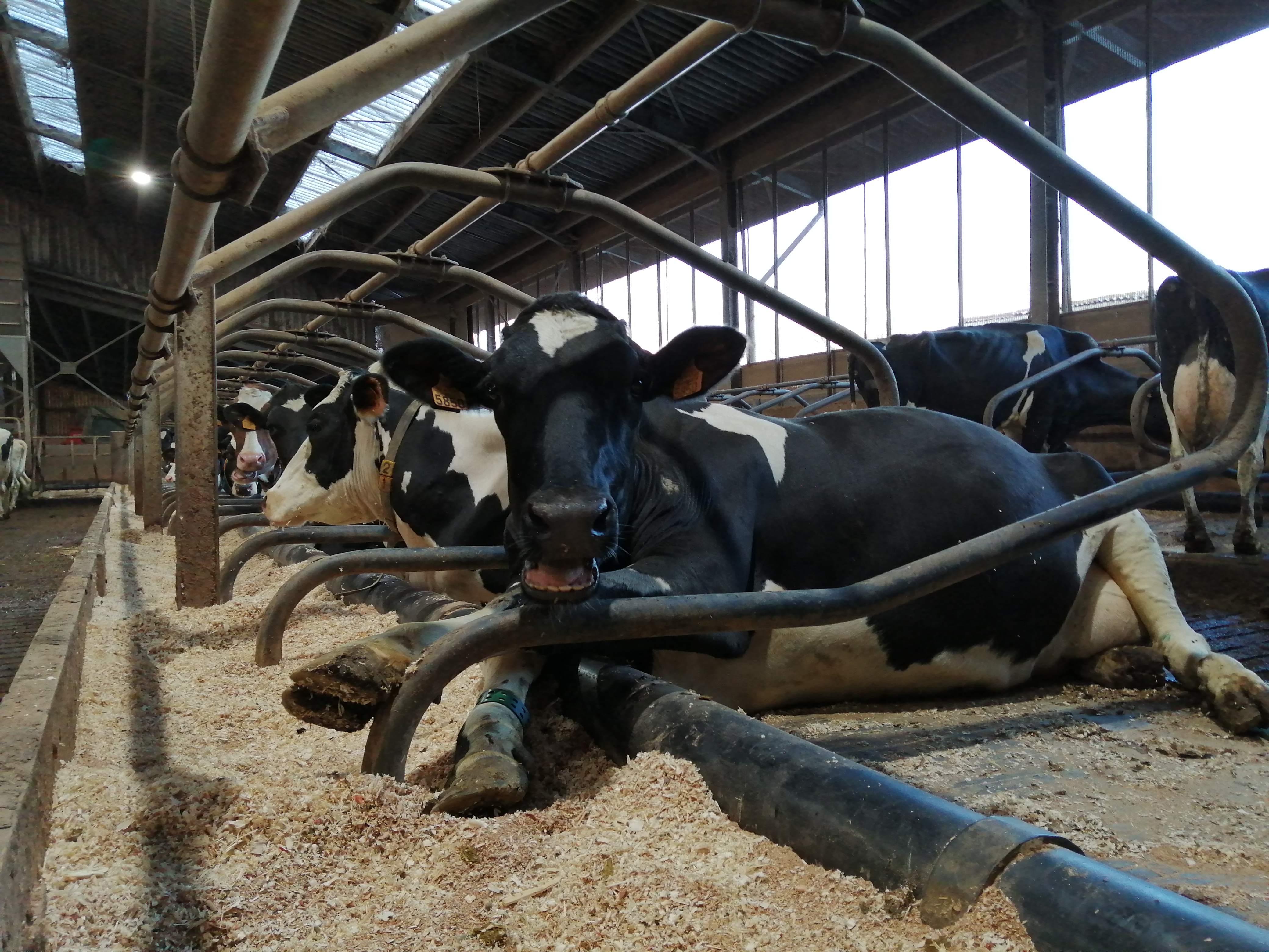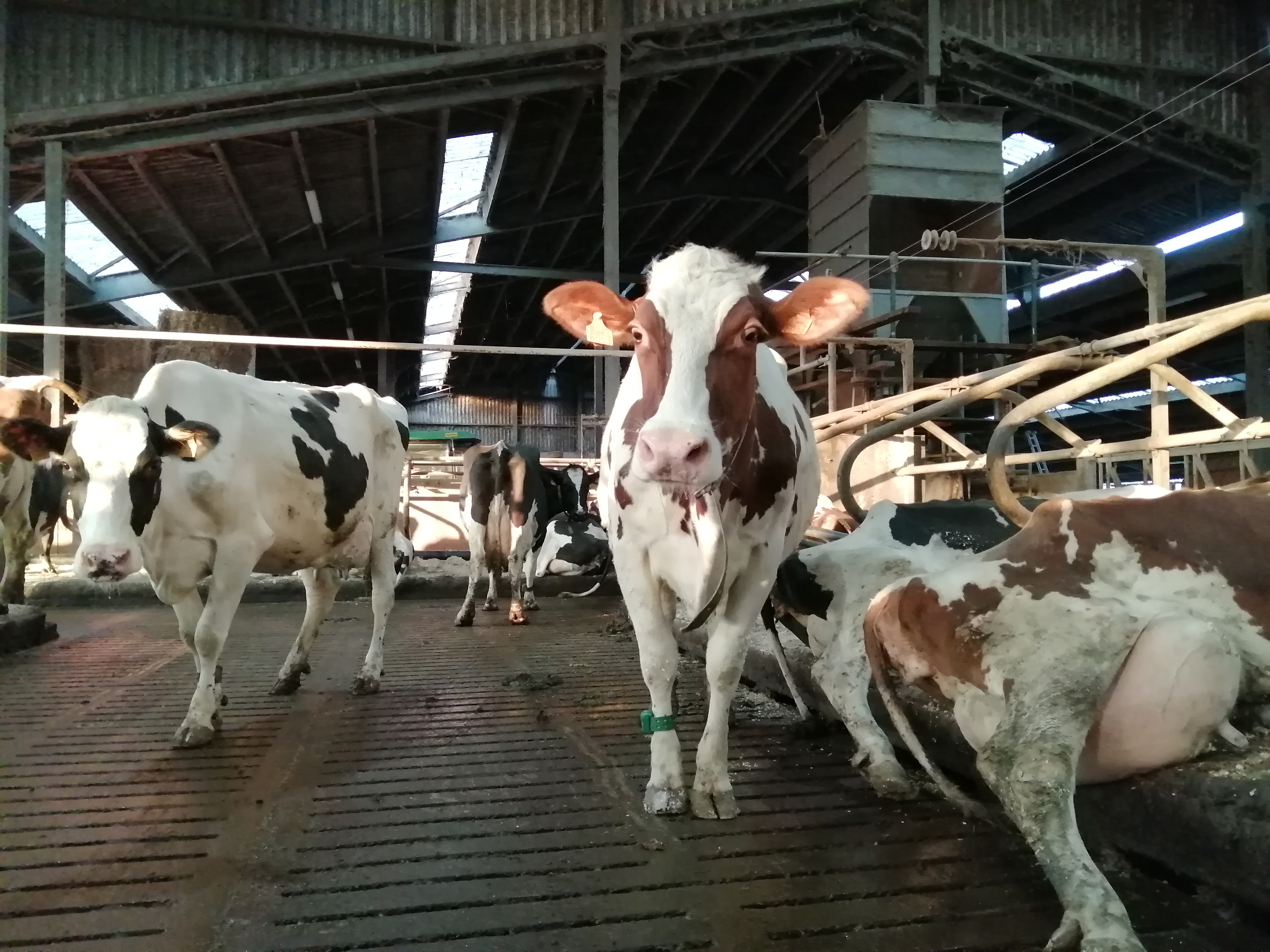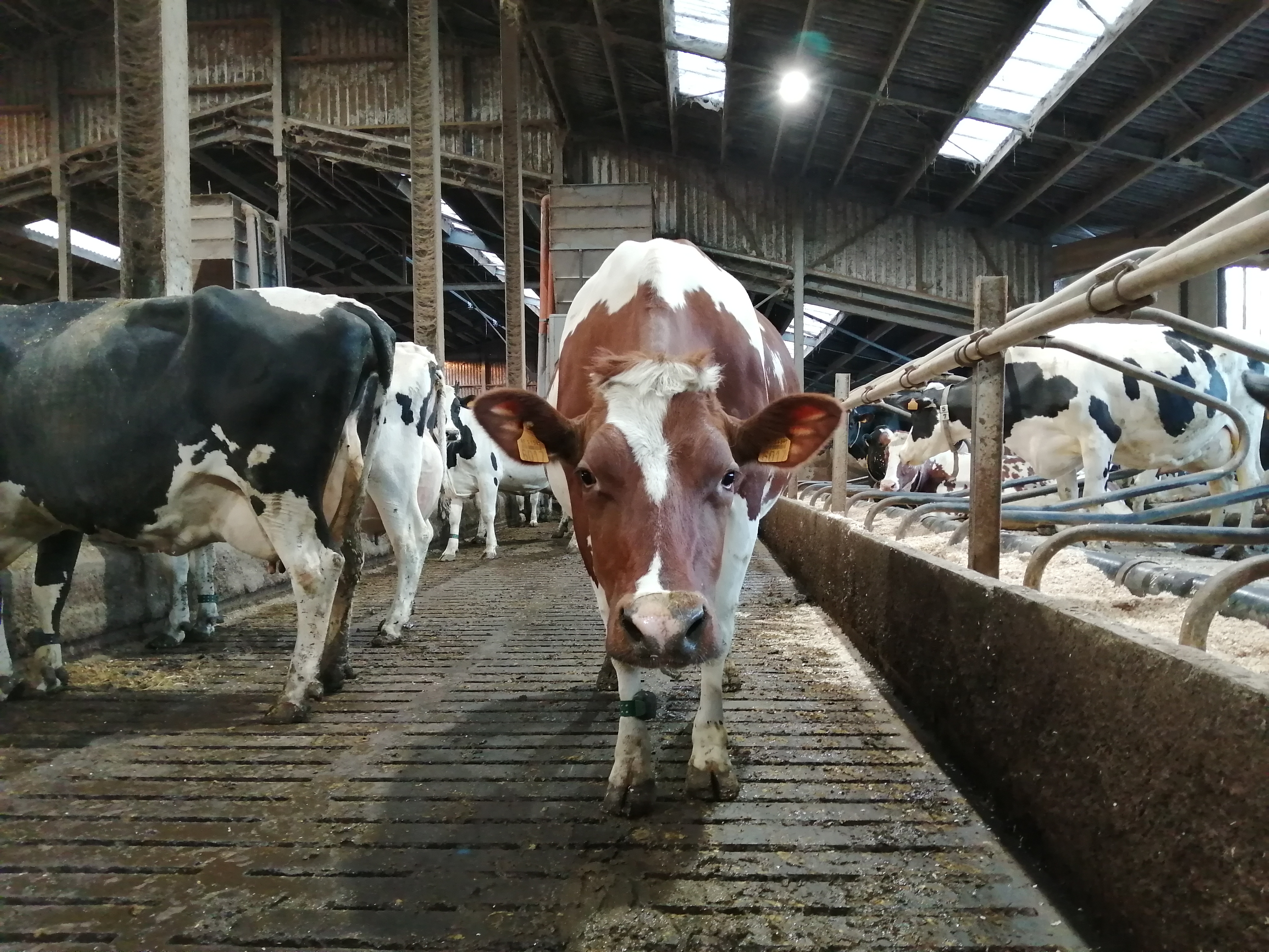 Koe Lettie keek recht naar m’n lens, hoe mooi! Rechts in de ligboxen zien we m’n allerliefste Becky staan piepen. Achteraan staat een koe met haar scheef kopje ook nieuwsgierig te kijken.