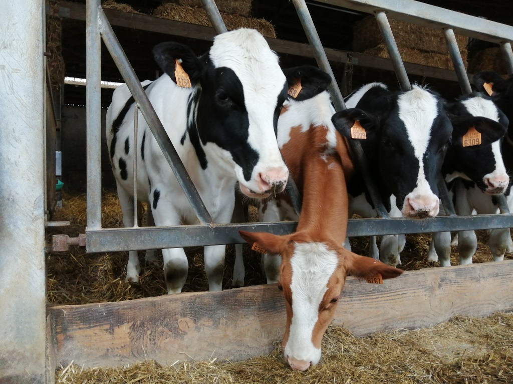 De beestjes op stal zijn wel nog altijd gelukkig! Ik geef ze veel en lekker voeder – dat we nu wel meer moeten aankopen. Ze genieten van de warmte binnen! In het bericht over het eerste gras van 2020 stond ook een foto van kalfjes Thelma en Louise, die tweeling werd toen begin april geboren. Nu zijn ze dus één jaar! Ik deel graag nog enkele foto’s van hen van vandaag. Ze zijn al goed gegroeid maar zitten wel iets achter op hun leeftijd. Normaal zouden ze al op roosters met ligboxen zitten, maar ze verblijven nu nog in een groep op stro. Maar ze stellen het geweldig! Ze staan echt heel veel naast elkaar te eten. Thelma is de rood-witte en de kleinste, Louise de zwart-witte en de grootste. Maar ze stralen allebei, kijk zelf maar…