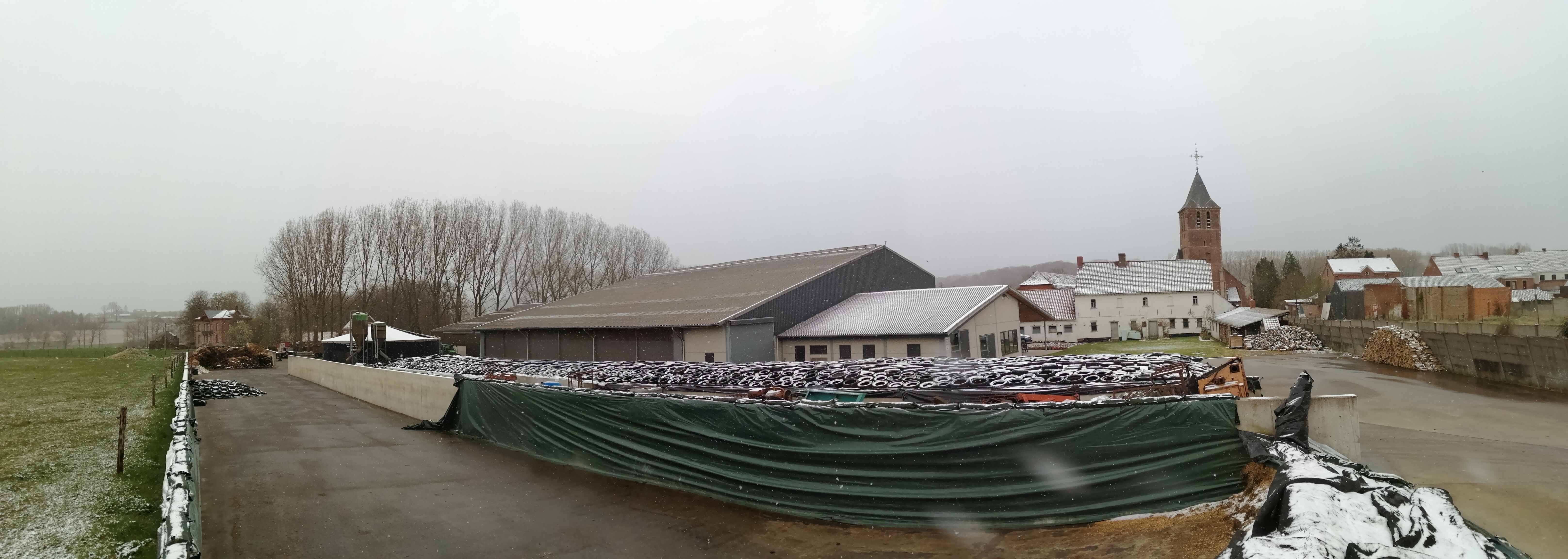 Vorig jaar zaten op 8 april niet alleen de koeien al buiten, we waren ook effectief bezig met (een deel van) de eerste snede gras maaien! Daarover schreef en toonde ik in Eerste gras van 2020. Amai, toen was het hier 23 à 24 graden met een stralende zon – terwijl het in het zuiden van Europa regende met een 18 graden! Heel wat anders dan niet ver boven het vriespunt nu. Met veel grijze lucht, maar ook opklaringen, en dan zijn die donkere wolken er terug.