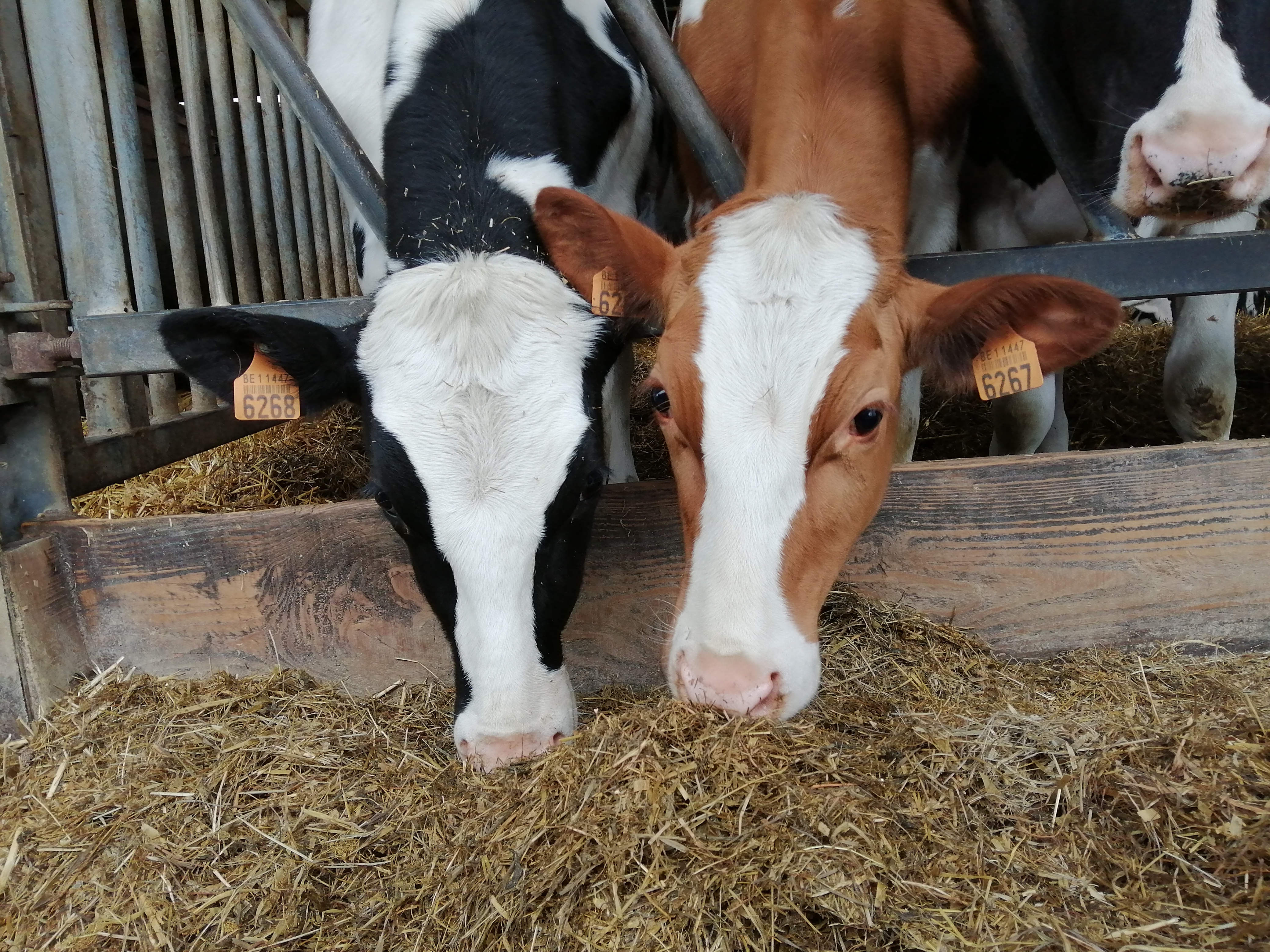 De beestjes op stal zijn wel nog altijd gelukkig! Ik geef ze veel en lekker voeder – dat we nu wel meer moeten aankopen. Ze genieten van de warmte binnen! In het bericht over het eerste gras van 2020 stond ook een foto van kalfjes Thelma en Louise, die tweeling werd toen begin april geboren. Nu zijn ze dus één jaar! Ik deel graag nog enkele foto’s van hen van vandaag. Ze zijn al goed gegroeid maar zitten wel iets achter op hun leeftijd. Normaal zouden ze al op roosters met ligboxen zitten, maar ze verblijven nu nog in een groep op stro. Maar ze stellen het geweldig! Ze staan echt heel veel naast elkaar te eten. Thelma is de rood-witte en de kleinste, Louise de zwart-witte en de grootste. Maar ze stralen allebei, kijk zelf maar…
