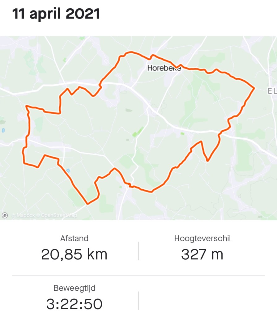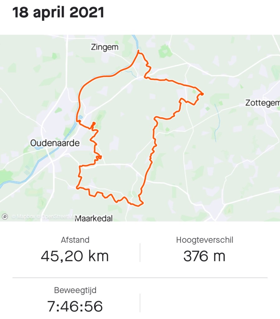 Net als al onze andere voorbereidingswandelingen starten we steeds vanuit Schorisse dorp. We gingen op 3 april op avontuur richting Louise-Marie, op 11 april gingen we richting Horebeke en Mater met een groot stuk door Maarkedal en op 18 april ondernamen we onze grootste tocht tot nu toe: 46,5 km langs de Zwalmbeek en de Schelde. Onderstaande Strava zegt inderdaad 45,20 km maar die van m’n zus zei 46,50 km. Geen idee hoe het komt maar mijn Strava vergeet precies altijd enkele honderden meters op te tellen.