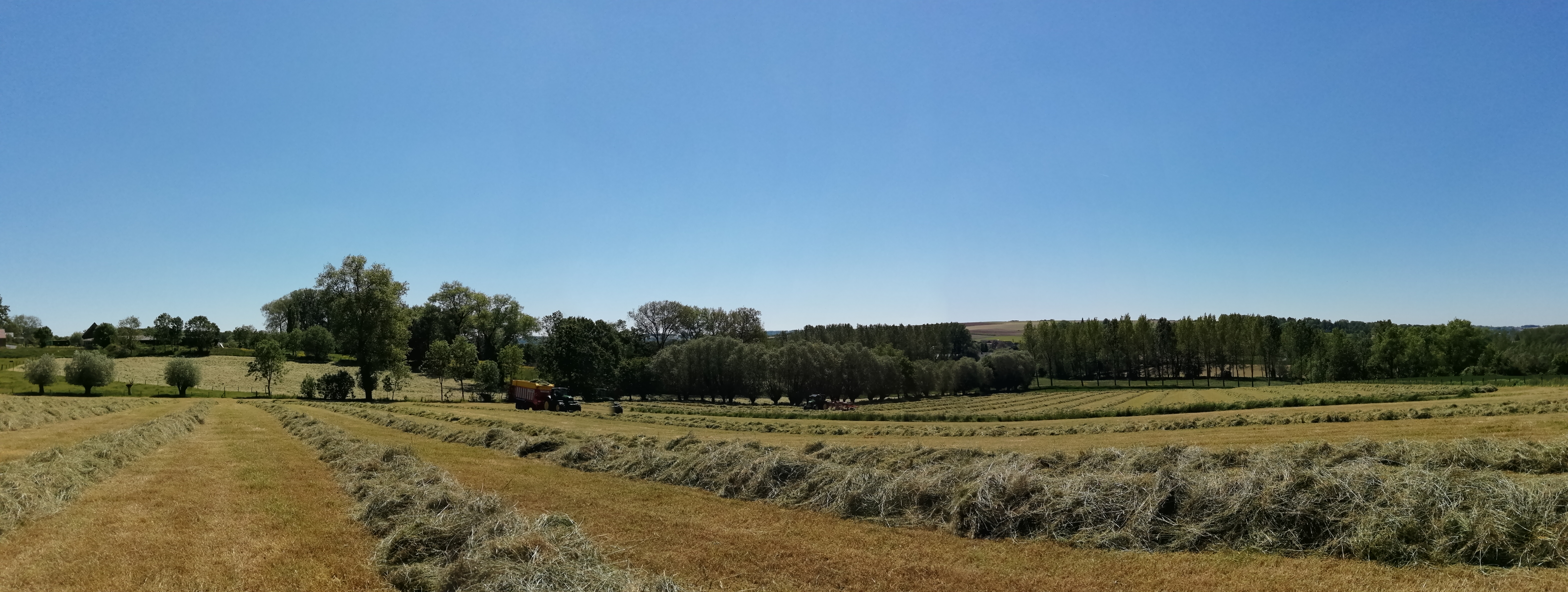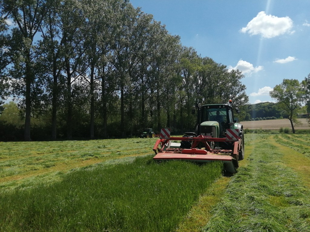 We hebben er lang op moeten wachten – de eerste 20 ha gras van 2021 werd op 23 en 24 april gemaaid – maar uiteindelijk werd het terug maaiweer! Op zaterdag 29 mei ging vader van start met het maaien van de tweede snede raaigras en de hele lange eerste snede weidegras. Moeder Veerle schudde het gras open – en waar veel op was, ging ze de dag erna nog eens door. Twee dagen later harkte ze het gras op rijtjes, ze was niet bij te benen! Vader Herman haalde het gras naar huis met de opraapwagen, met wat hulp van zus Valerie en vriend-des-huizes Jeffrey. Uiteindelijk dekten we de kuil op woensdag 2 juni opnieuw af, na hem op zondagnamiddag te hebben bloot gemaakt – het wordt een lasagnekuil. Vele helpende handen maakten het werk licht! Verder in dit bericht foto’s van alle stappen, alsook enkele beelden van wat er nog te beleven viel op de weide die week: een opname van een promotiefilmpje en een fotoshoot met een luchtballon!