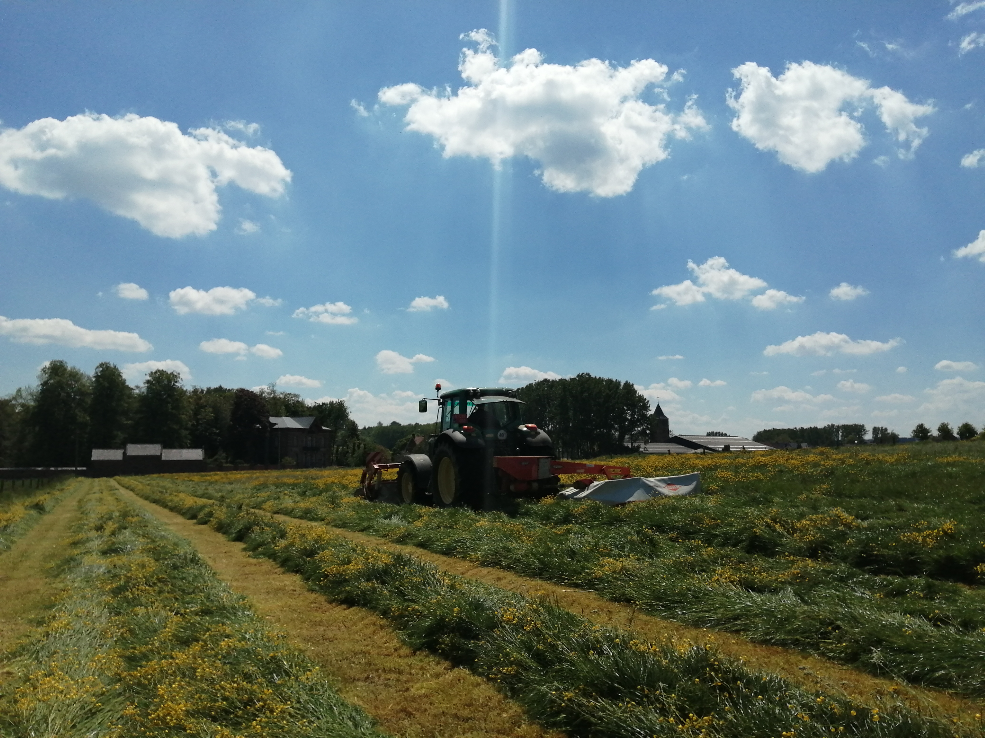 We begonnen met de weides rond onze boerderij. Deze eerste weide was dit jaar nog gesproeid tegen onkruid en stond dus erg mooi. De weide naast ons hof kan ook eens een sproeibeurt gebruiken, die ziet geel van de bloemen, al oogt het ook wel nog fijn.