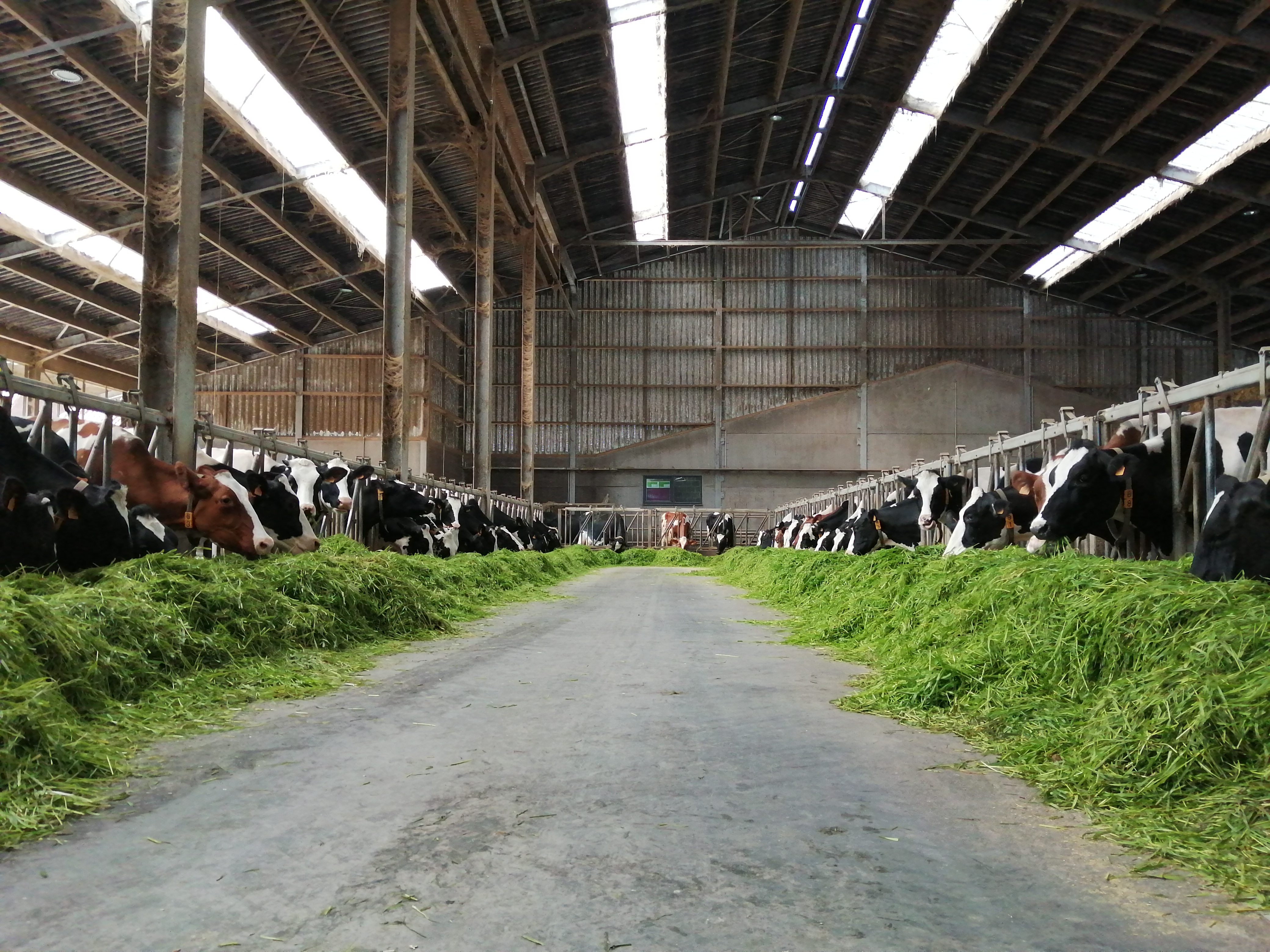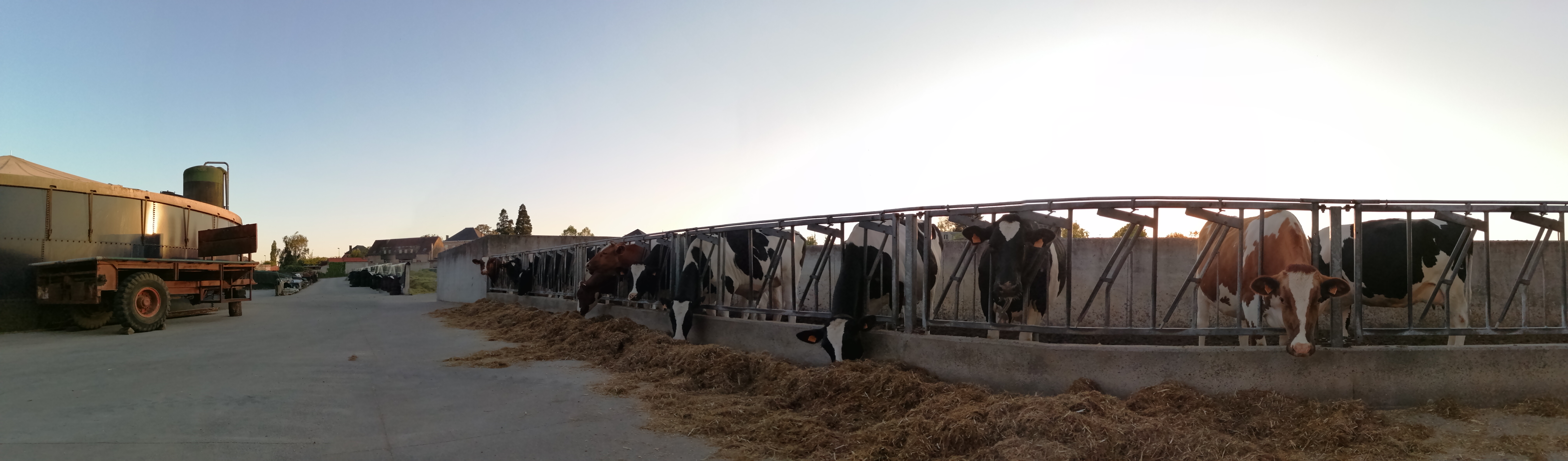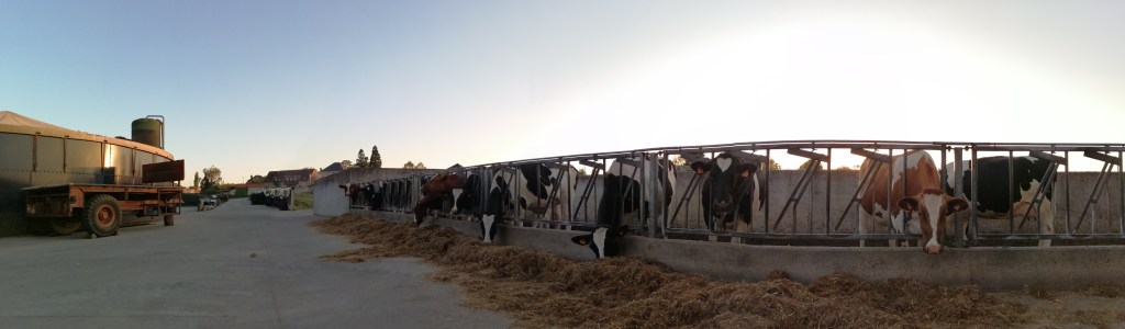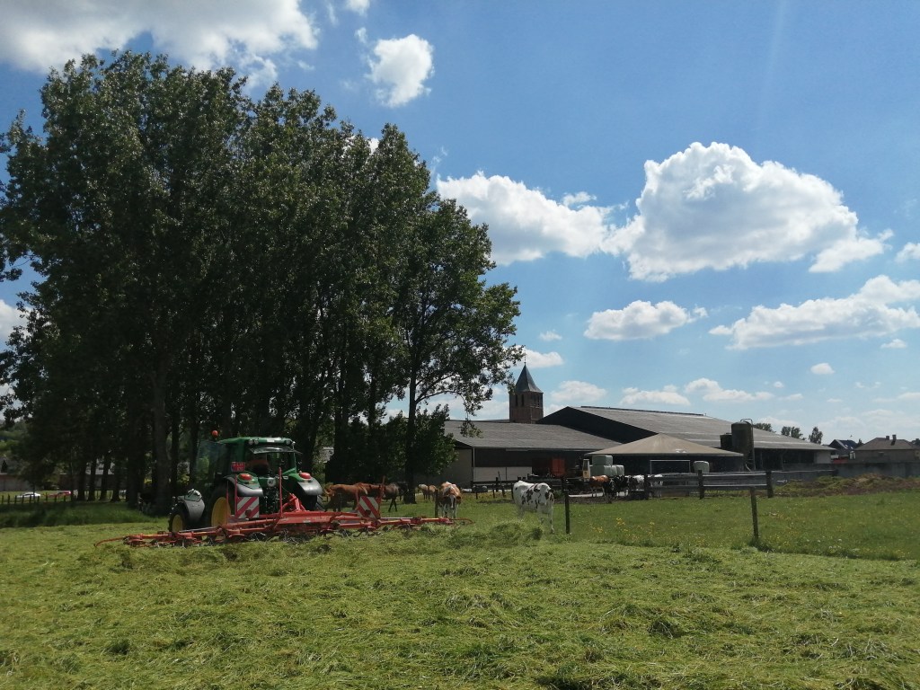 Hieronder heb ik een foto van onze koeien die het verse gras aan het smullen zijn. Wanneer vader een dag moet maaien, gaat hij eerst om vers gras voor de koeien. Daarna wordt de opraapwagen afgehangen van de tractor en de achterste maaier aangehangen. Tegen zonsondergang – wanneer vader een hele dag gemaaid heeft – wordt die achterste maaier dan terug afgehangen en gaat de opraapwagen terug aan de tractor. Dan kunnen de koeien nu hun tweede portie vers gras krijgen. Dit keer werd zaterdag en zondag, tussen ongeveer 11u30 en 21u, gemaaid – met enkele pauzes om te eten. Er ging ongeveer 32 ha gras af.