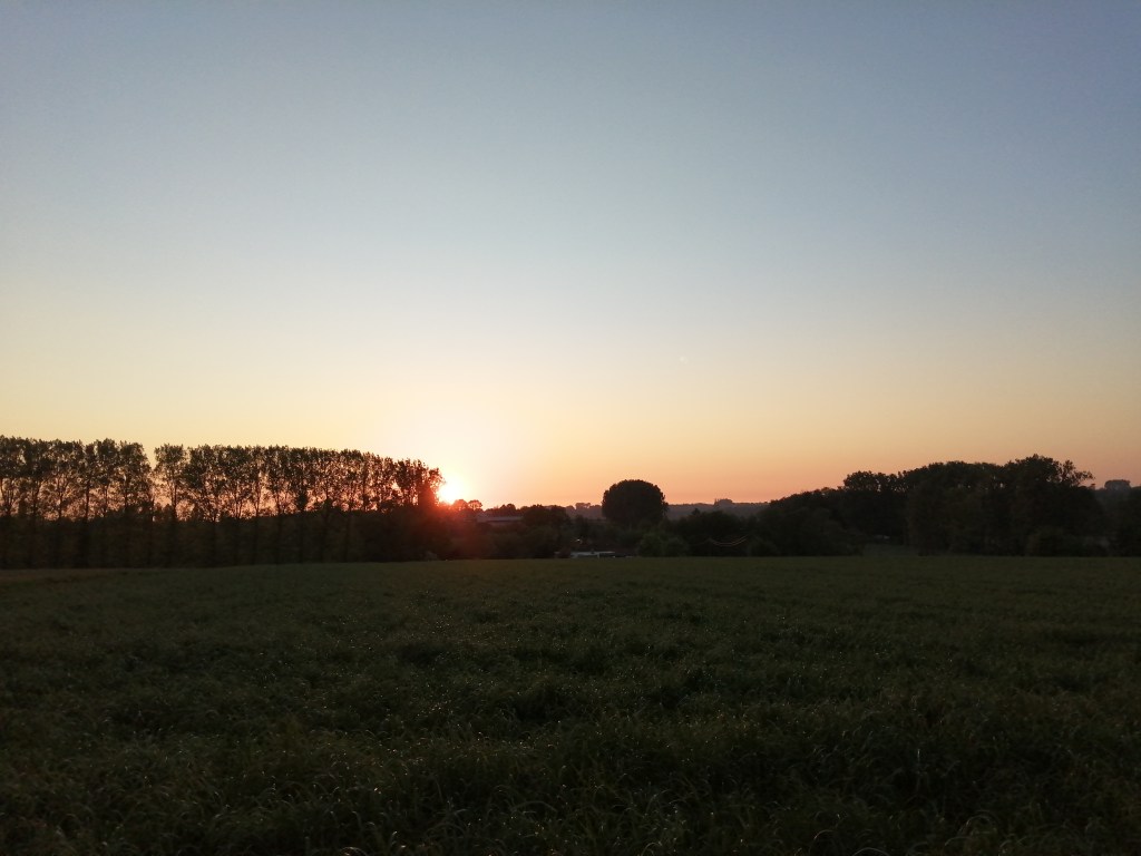 Bij een prachtige zonsondergang gingen nonkel Raf en ik nog mee met papa Herman om vers gras voor de koeien. Wanneer de buitentoeren worden gemaaid, gaat er altijd iemand mee om de hoeken te kuisen, zodanig dat al het gemaaide gras meteen mee naar huis is.