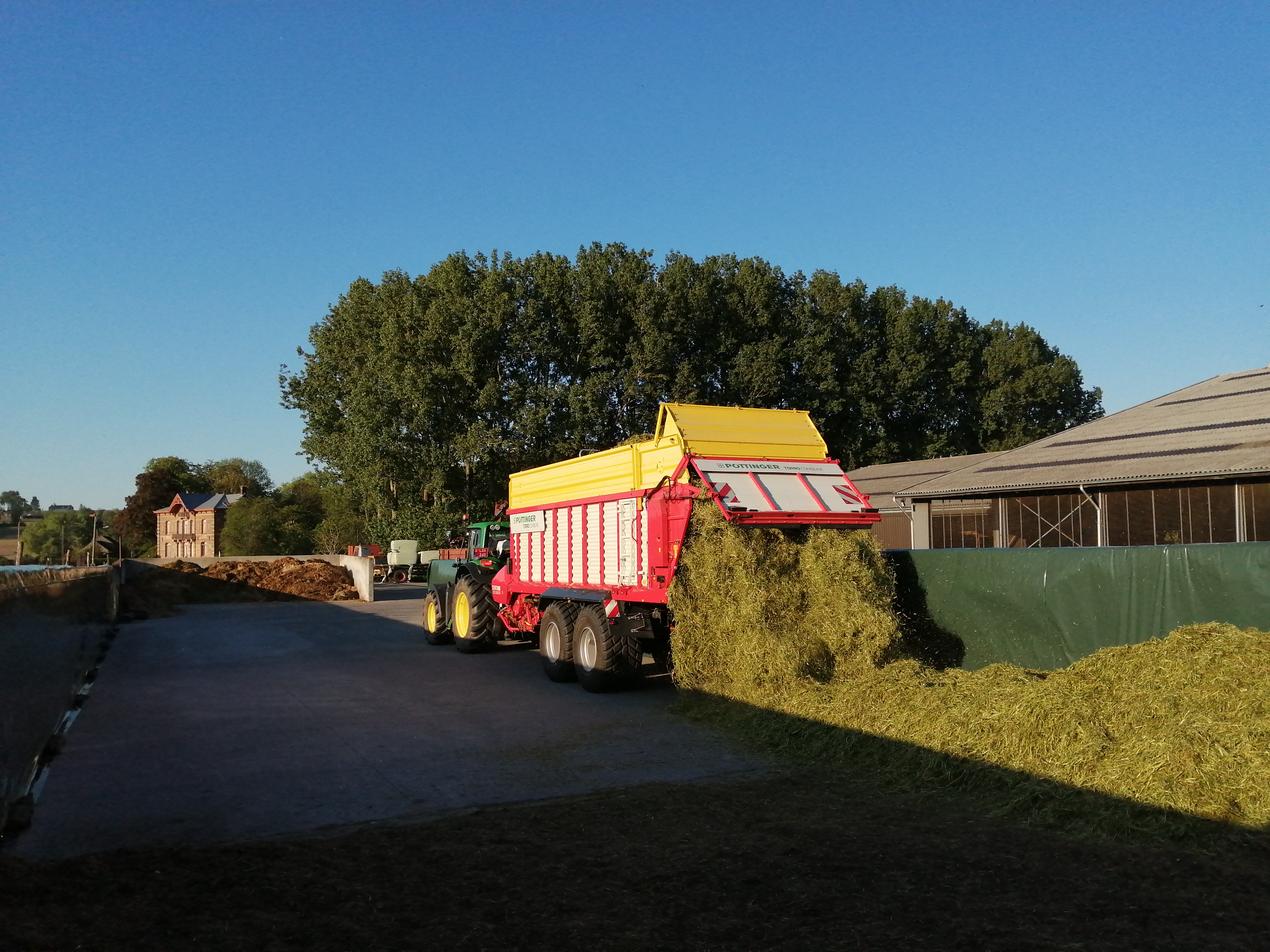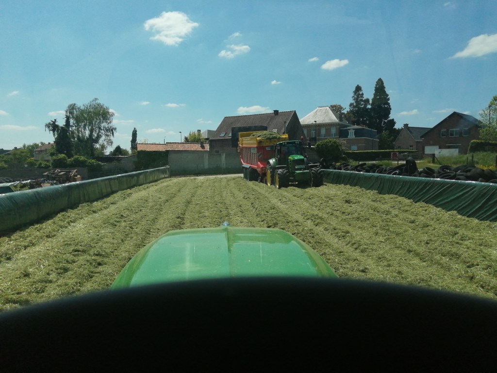 Omdat het ideaal weer was en het gras snel droogde, begon moeder Veerle zondag rond 18u30 al te harken. Jeffrey kon dan al beginnen met het gras naar huis halen met de opraapwagen. Er waren toch velden bij die ver van huis lagen – het verste iets meer dan 10 km – en met de tractor is dat toch een eind bollen. We konden dus maar beter op tijd beginnen, want vanaf woensdagavond werd onweer voorspeld. Rond 20u zondagavond werd het eerste gras thuis op de kuil gelost. Jeffrey reed tot 1 uur ’s nachts.