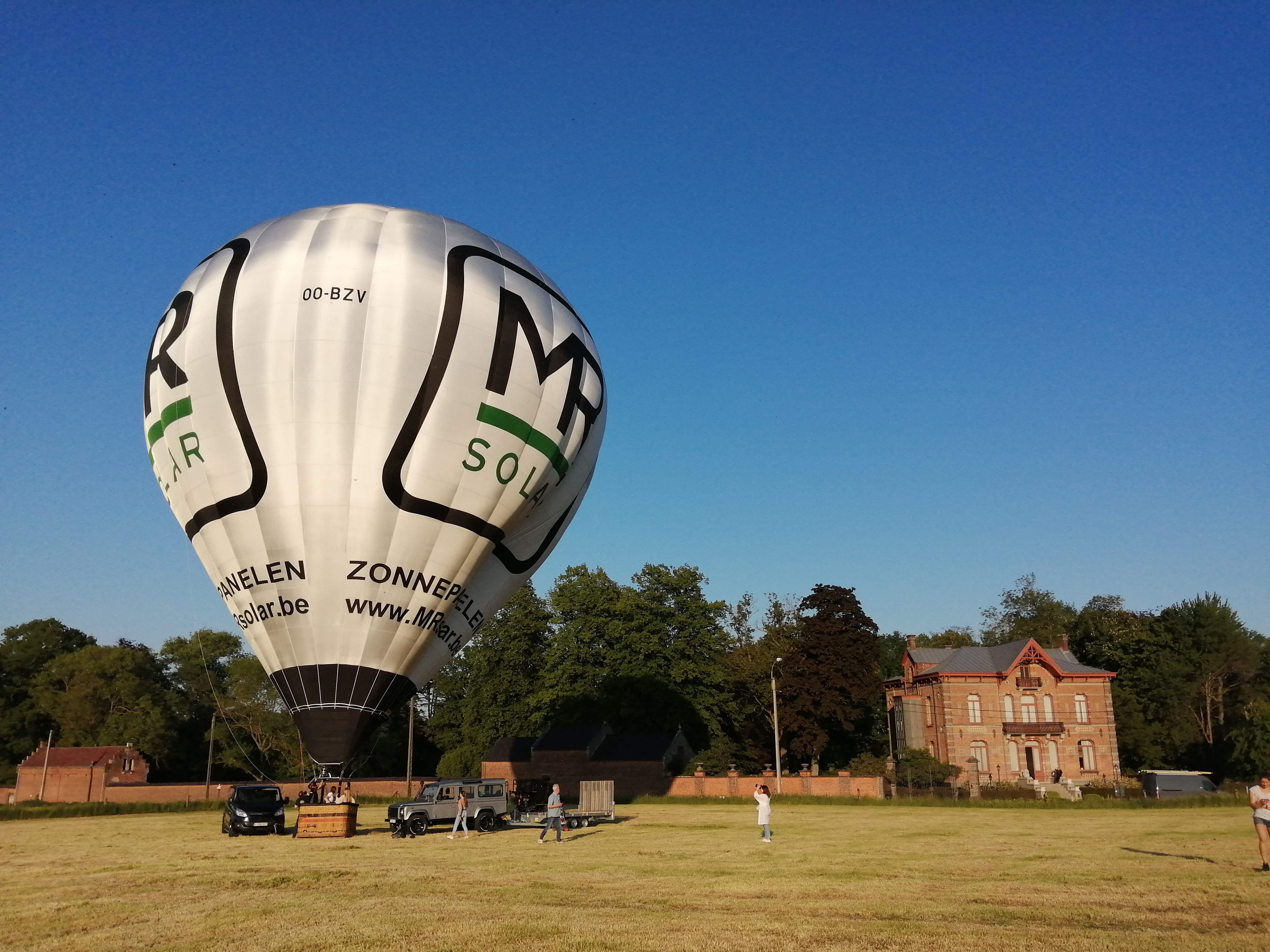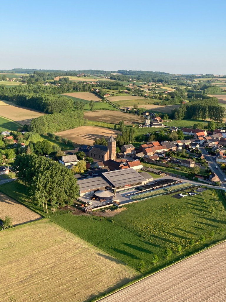 ’s Avonds rond 20u was onze pas gemaaide en opgeraapte weide dan weer het toneel voor een fotoshoot met een luchtballon. Een koppel verloofde zich en wou daar foto’s van. Na enkele foto’s terwijl de ballon plat lag en nog wat foto’s in de mand, ging de luchtballon omhoog. Ramses, ballonvaarder van Skyview Balloons, bezorgde me bovenstaande geweldige foto van onze boerderij.