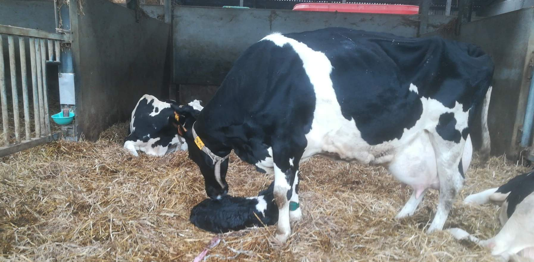 Jawel hoor, Becky kalft op zondag! Ik was er niet bij – ik was gaan wandelen – maar mama Veerle stuurde me deze foto door. De kalving ging erg vlot, super dus! Alleen niet zo super: het was opnieuw een stier! Echt jammer, want het was de eerste keer dat het me gelukt was haar via KI (kunstmatige inseminatie) drachtig te krijgen. Haar tussenkalftijd (TKT = de tijd tussen haar kalving vorig jaar en deze kalving) bedroeg 448. Dit is vrij goed, we streven naar 380 à 400 dagen, maar voor een koe met een productie als haar is meer dan 400 zeker niet erg.