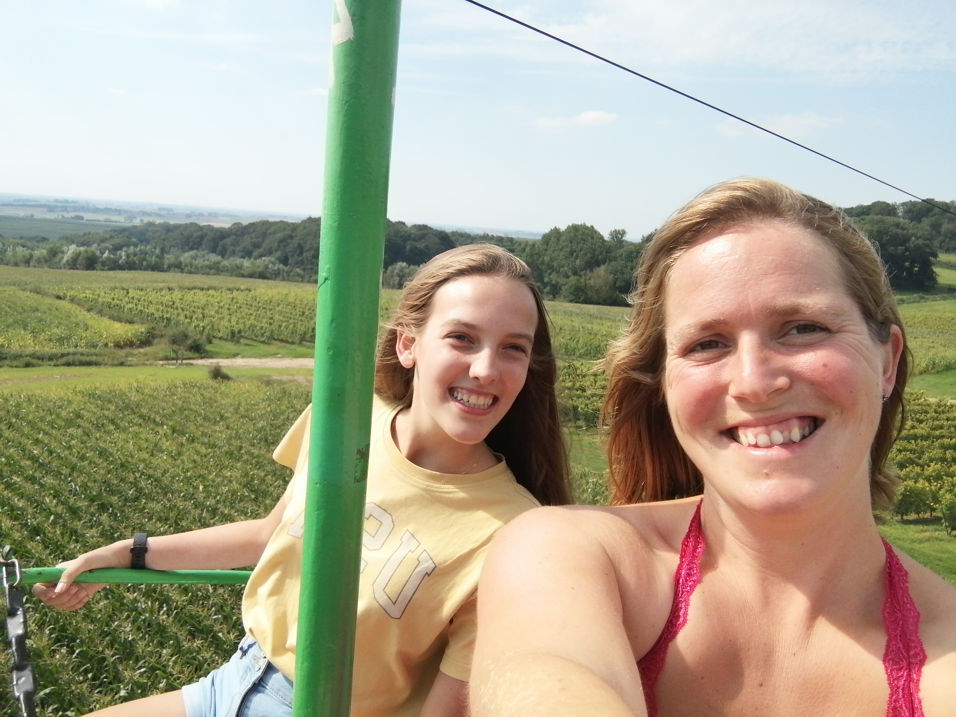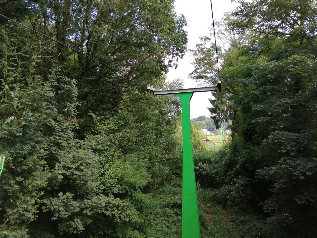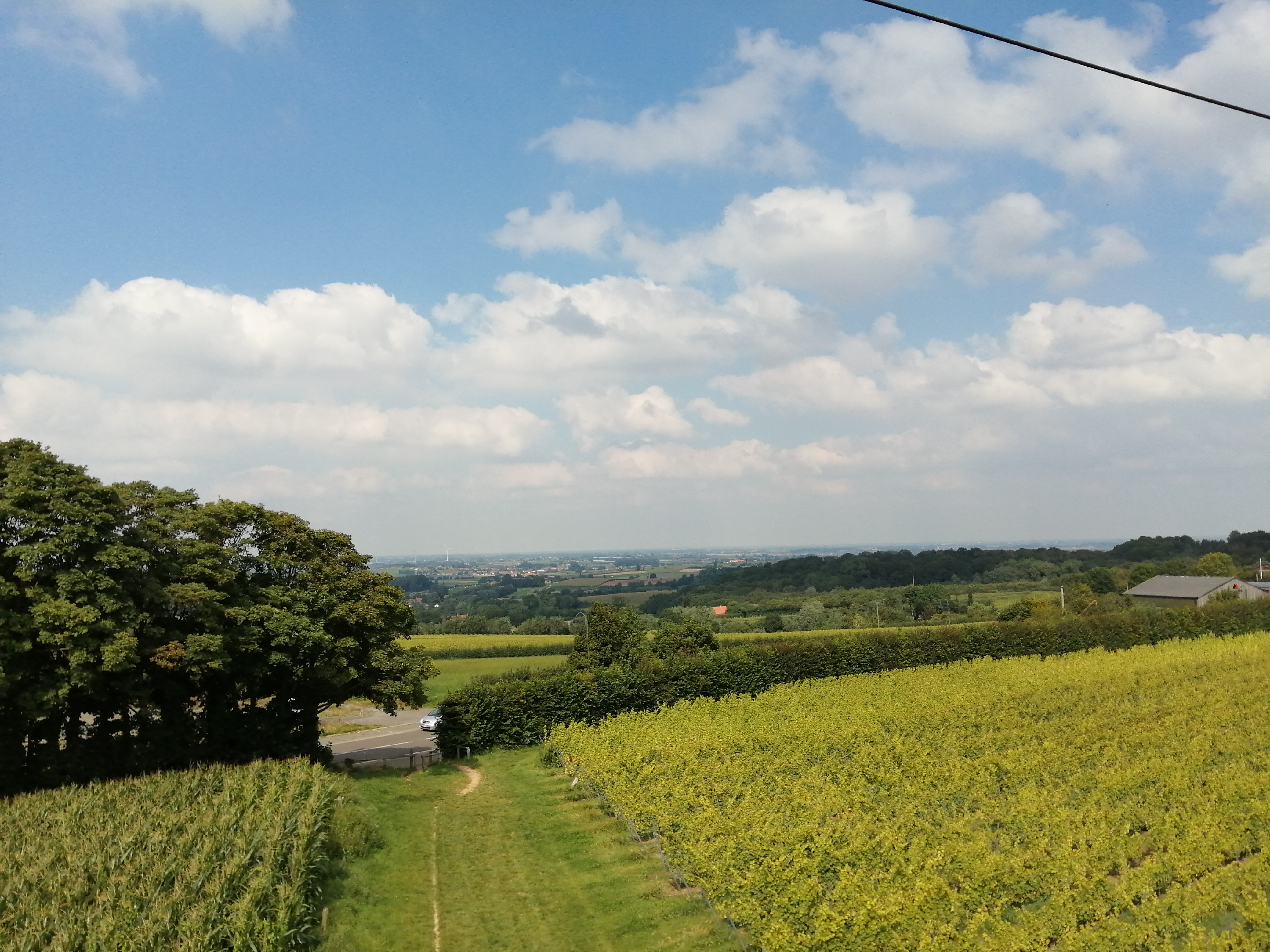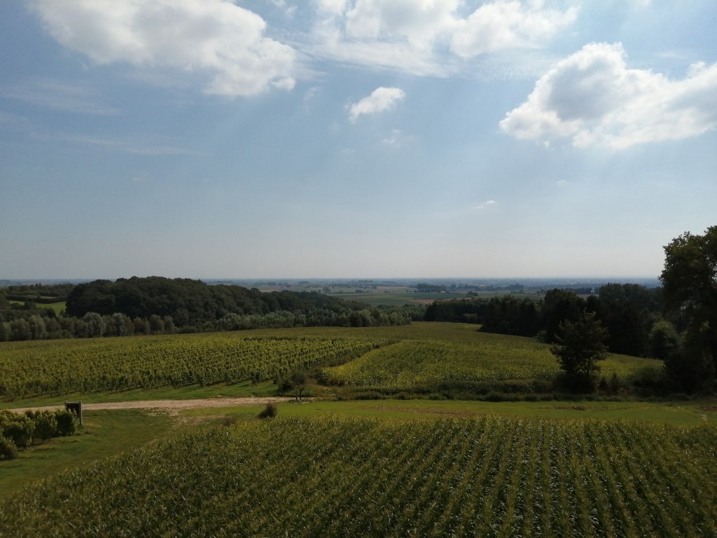 Maar laat me je niet afschrikken! Het uitzicht is echt meer dan de moeite waard! Eerst zit je nog tussen bomen en boven de straat, maar dan kom je in het prachtige Heuvelland terecht. Je zweeft boven de groene velden en de kleurrijke wijngaarden van Entre-Deux-Monts. Je ziet vanalles rond je heen… Als het mooi uitgeklaard is en je de tijd neemt om goed te kijken, kan je naar het schijnt zelfs de zee zien en de Ijzertoren in Diksmuide.