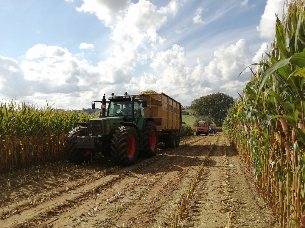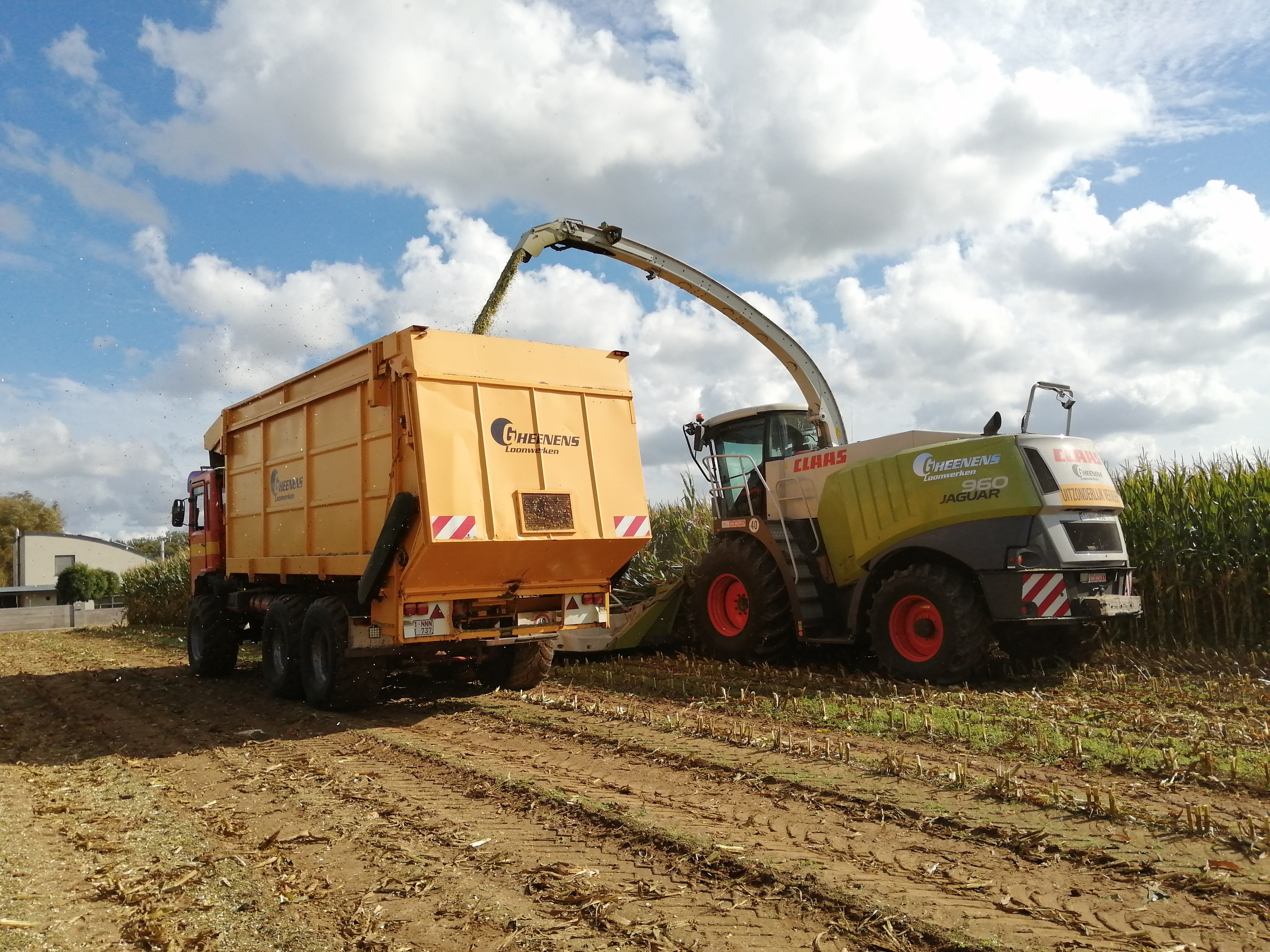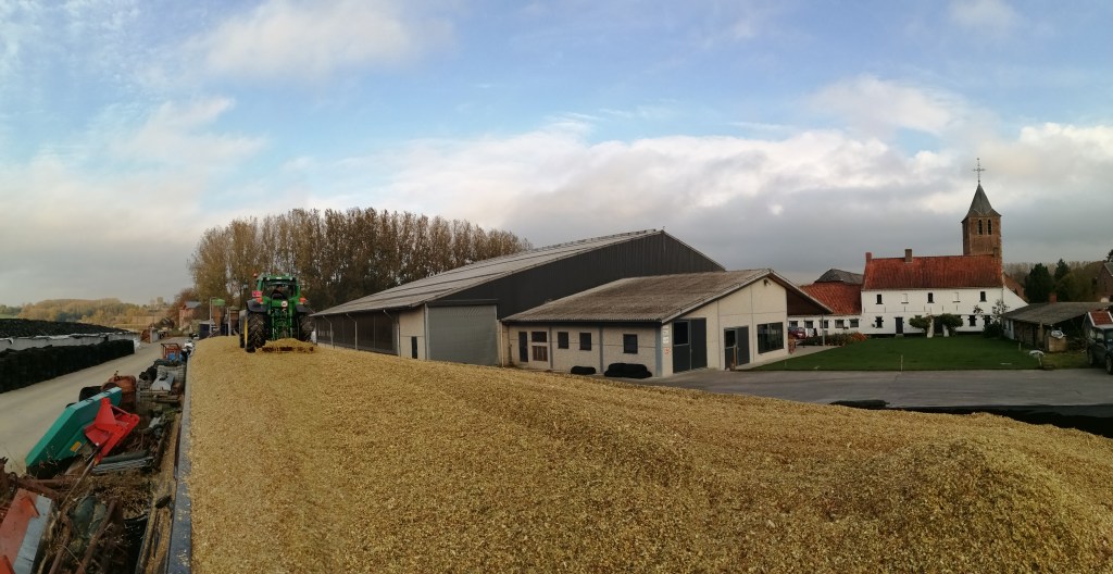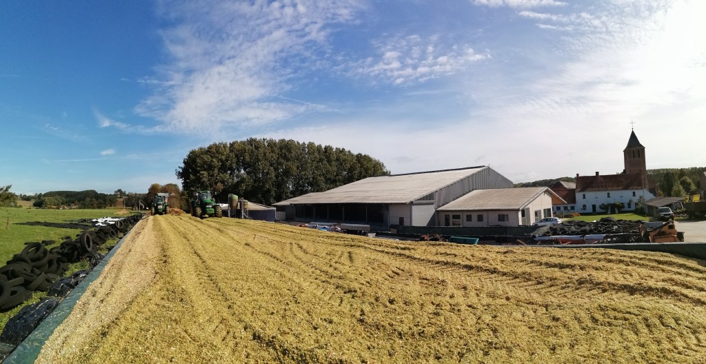 Op 28 september werd onze eerste helft maïs ingekuild. Het was een prachtige dag, met zon en mooie temperaturen. Het was ook nog niet echt herfst, dat zie je ook aan de groene bladeren die nog volop op de bomen staan.