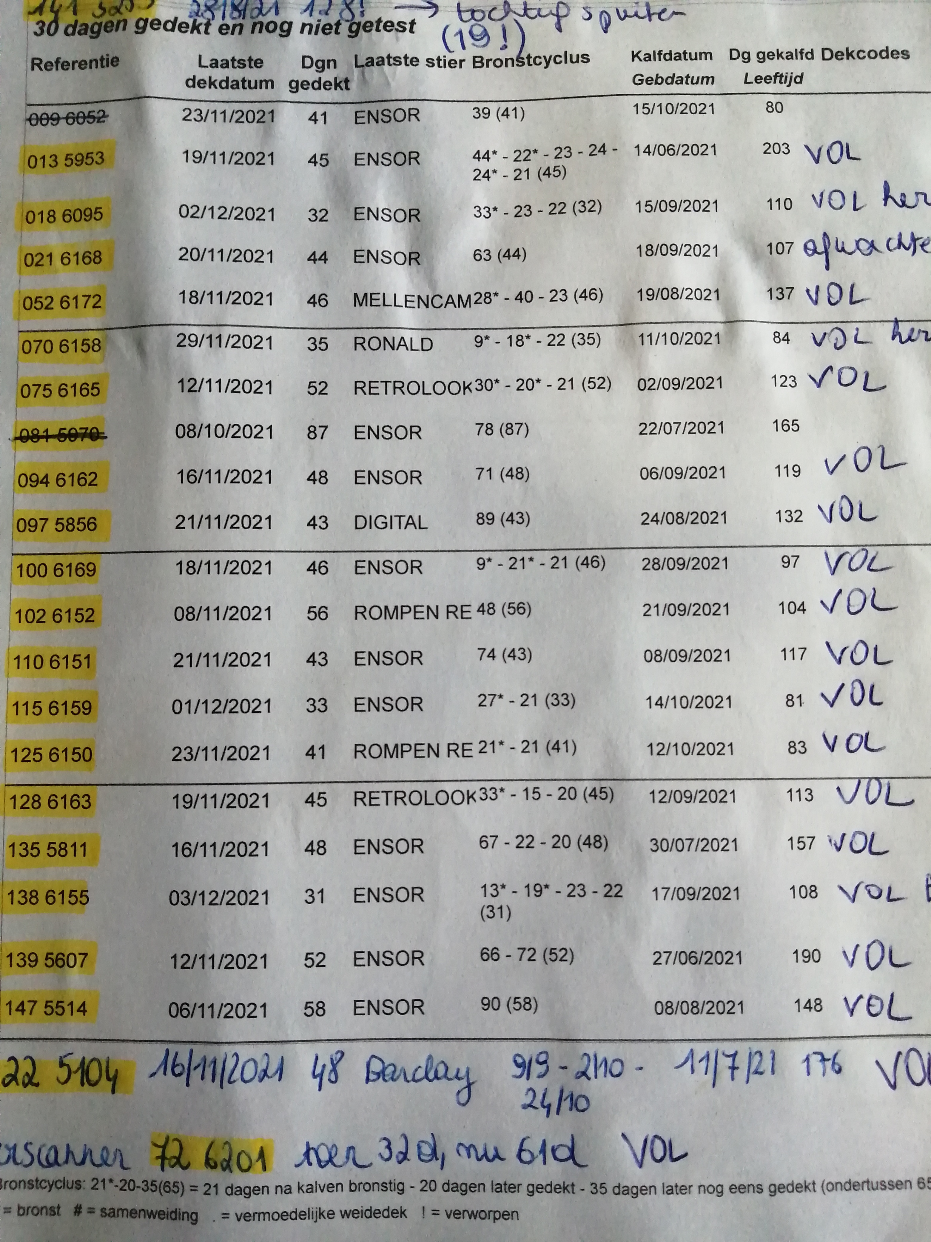 Want momenteel is ze ook terug drachtig! Maandag werd ze gescand door veearts Bart en we kregen goed nieuws! De 4e inseminatie die ik uitvoerde, was de goeie! Zo is het terug uitkijken naar haar volgende kalving, uitgerekend voor half augustus. Dat zal samenvallen met een hele hoop kalvingen, want 19 van de 20 koeien werden deze maand drachtig gescand. Hieronder het lijstje. Ook bij het jongvee werden er enkele gescand: daar was het 8 op 8! Meer weten over koeien scannen? Lees Vruchtbaarheidsbegeleiding en drachtcontrole.