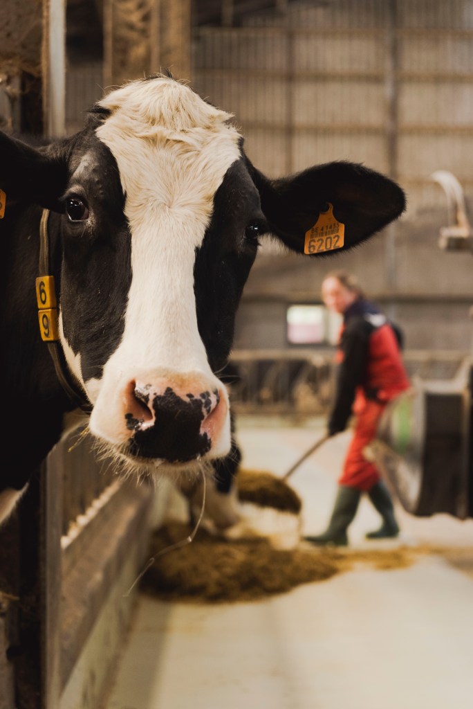 In februari en maart 2022 kregen we twee studenten fotografie op bezoek op de boerderij. Erik en Felix contacteerden me elk afzonderlijk. Ze studeerden beiden fotografie, maar niet via dezelfde opleiding. Ik stel onze boerderij daar graag voor open. Ik hou ook van foto’s nemen en ik vind koeien ook prachtige fotomodellen. Maar voor buitenstaanders is het in de winter niet makkelijk om dieren te fotograferen. Koeien zijn dan niet terug te vinden op de weide. Ook van het voederen namen ze foto’s. Ik deel graag enkele van hun kiekjes. Ikzelf nam onderstaande foto van Felix in actie. Verder ontdek je dus welk prachtplaatje hij hier maakte.
