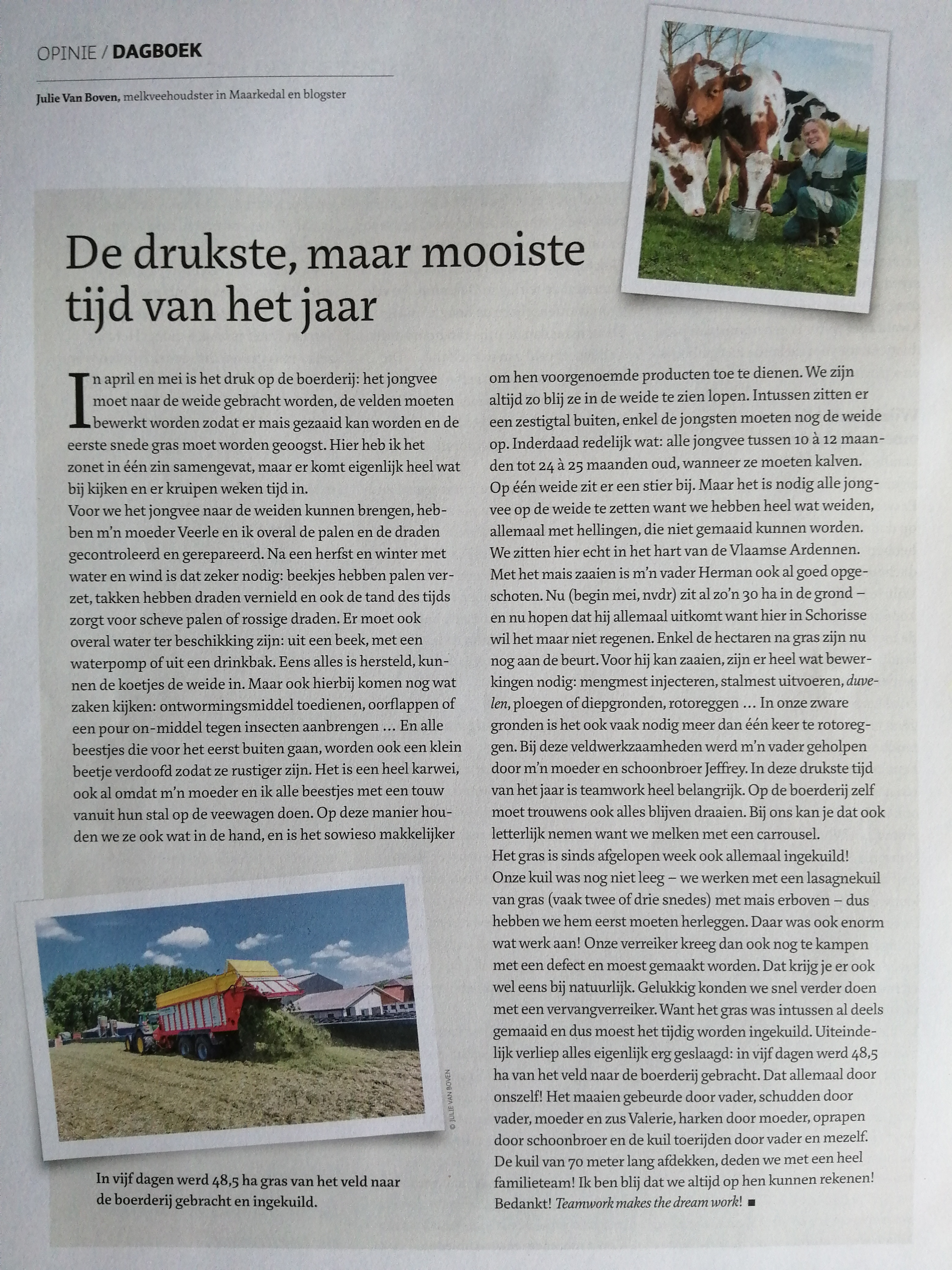 Het gras is sinds afgelopen week ook allemaal ingekuild! Onze kuil was nog niet leeg – we werken met een lasagnekuil van gras (vaak 2 of 3 snedes) met maïs erboven – dus hebben we hem eerst moeten herleggen. Daar was ook enorm wat werk aan! Onze verreiker kreeg dan nog te kampen met een defect en moest naar de maak. Dat krijg je er ook wel eens bij natuurlijk. Gelukkig konden we snel verder doen met een vervangverreiker. Want het gras was intussen al deels gemaaid en dus moest het tijdig ingekuild worden. Uiteindelijk verliep alles eigenlijk erg geslaagd: op 5 dagen tijd werd 48,5 hectare van het veld naar de boerderij gebracht. Dat allemaal door onszelf! Het maaien gebeurde door vader, schudden door vader, moeder en zus Valerie, harken door moeder, oprapen door schoonbroer en de kuil toerijden door vader en ikzelf. De kuil van 70 meter lang afdekken, deden we met een heel familieteam! Ik ben blij dat we altijd op hen kunnen rekenen! Bedankt! Teamwork makes the dream work!