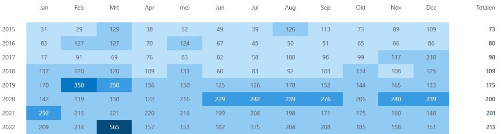 Per maand telde m’n blog in 2022 gemiddeld 6 503 bezichtigingen en 4 006 bezoekers. Per dag zijn dit voor 2022 gemiddeld 213 bezichtigingen en 131 bezoekers. In 2021 had ik gemiddeld 110 bezoekers per dag (in 2020 en 2019 respectievelijk 101 en 74 bezoekers) dus dit is in 2022 opnieuw mooi gestegen. Het totaal aantal bezichtigingen van de afgelopen acht jaar is intussen over de 420 000 en het totaal aantal bezoekers gaat richting de 200 000!
