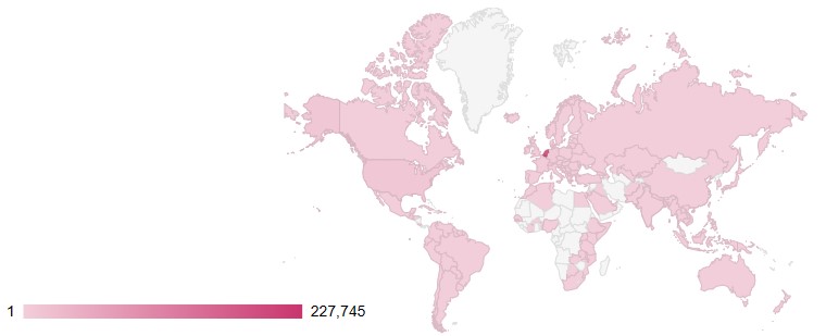 Hierboven zien jullie de totale cijfers van de afgelopen acht jaar. De eerste twee weken van 2023 zijn hier ook al bij omdat het statistieken zijn van “altijd”. In totaal staat België nog steeds aan de leiding! Ik geef hieronder opnieuw de wereldkaart mee. Ik keek eens goed en zag toch meer landen ingekleurd dan vorig jaar! Al zijn die aantal bezichtigingen in het verre buitenland te verwaarlozen.
