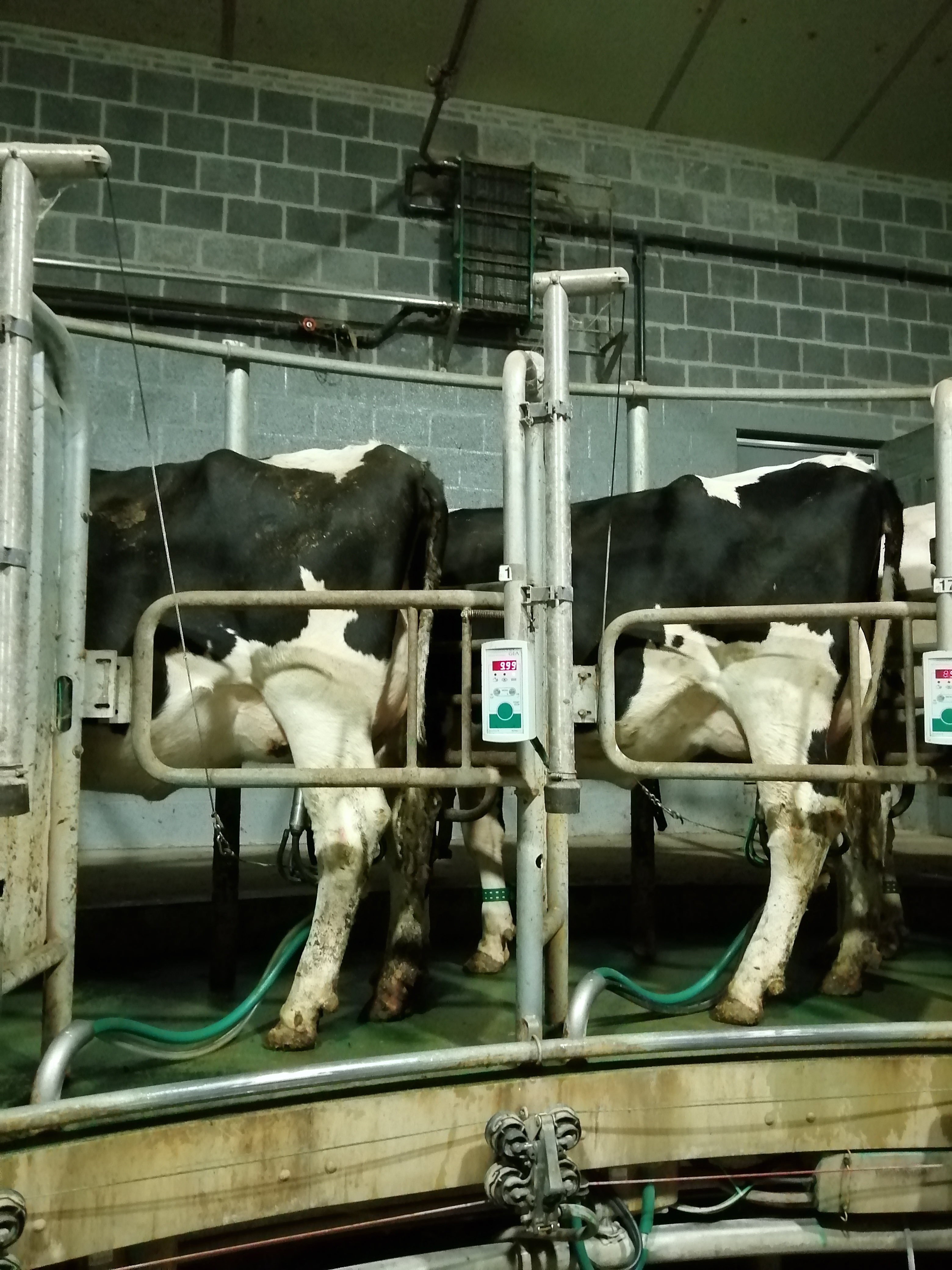 Als koeien toonde ik hen nog niet, maar amai, wat zijn Roxanne en Léonore prachtige koeien! Op de eerste foto zie je hen gezwind in de stal op weg naar de wachtruimte, op 13 september 2022. Het stof op de muur recht voor hen komt trouwens door de koeborstel. Op de tweede foto zie je hen samen op de carrousel, op 27 oktober 2022.