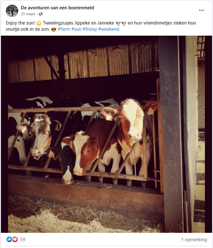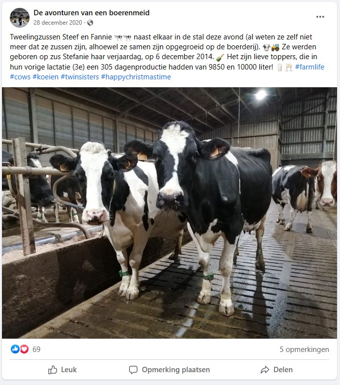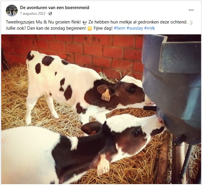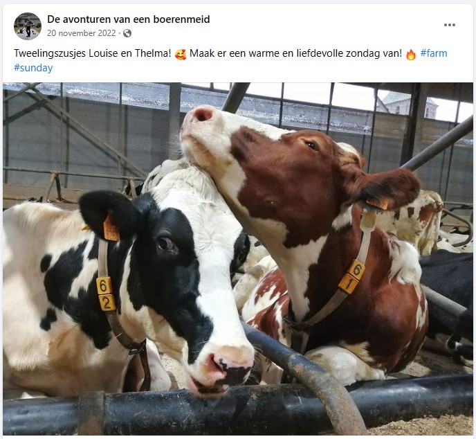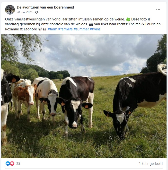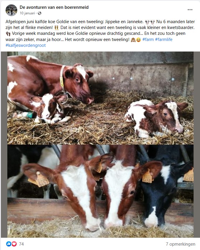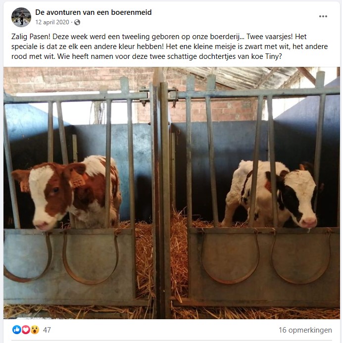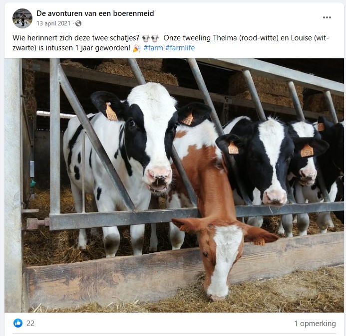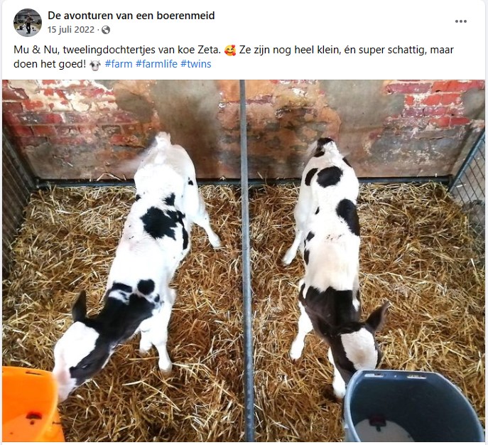 Ik deel op m’n Facebookpagina maar ook hier regelmatig berichten en foto’s van tweelingkalfjes. Ik blijf dat iets speciaals vinden. Zelfs al heb je bij koeien eigenlijk beter geen tweeling. Het vraagt toch wel veel (energie) van de koe. De koe heeft het na de geboorte van de kalfjes vaak moeilijker om op te starten. De tweeling zelf is kleiner en ook kwetsbaarder. Maar meestal spartelen die kleintjes zich wel door de kalverziekten die eventueel voorkomen – zoals diarree bijvoorbeeld. Later zijn ze gewoon even groot als alle andere koeien. Enkel wanneer het twee vaarsjes zijn, zullen ze trouwens op de boerderij blijven. Want bij een stier-vaars tweeling is het vaarskalfje meestal onvruchtbaar. In 2022 werd net als het jaar ervoor één vaarsjestweeling geboren. Kom het verder te weten met schattige foto’s… Ook van onze andere aanwezige tweelingzussen geef ik een mooie update!