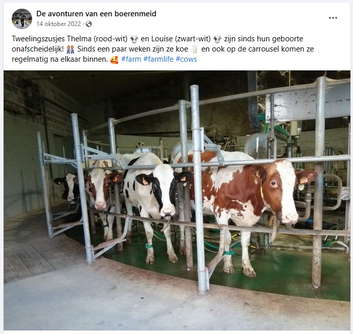 Thelma en Louise zijn intussen mooie koeien! Daar kon ik op Facebook ook al niet over zwijgen. In het begin kwamen zij effectief heel veel samen op de carrousel. Nu is dat precies al minder. Al zijn zij in de stal ook wel nog af en toe samen terug te vinden. Ze kennen elkaar wel goed hoor! Niet dat ik denk dat ze effectief weten dat ze zussen zijn. Maar ze weten dat ze altijd samen gezeten hebben. Bij andere koeien die altijd van kalfs af aan hebben samen gezeten, maar daarom niet familie zijn maar gewoon leeftijdsgenoten, zien we dat ook. Ze blijven elkaar kennen en opzoeken in de stal.