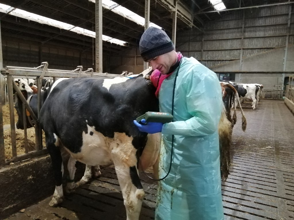 Sinds april 2020 komt veearts Bart ook elke maand voor vruchtbaarheidsbegeleiding en drachtcontrole. Op die manier volgen we alles nog korter op de bal op. Men kan al drachtig scannen vanaf 30 dagen dracht! Bij die vroege drachten wordt een maand later wel nog eens herscand. Zo zijn we zeker. Bij drachten boven de 40 dagen moet gewoonlijk niet herhaald worden. Bij het scannen in april weten we welk jongvee drachtig is en welk jongvee toch nog mee bij de stier de weide op moet.