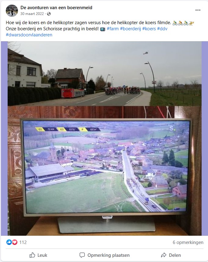 Ook dit jaar waren Schorisse en onze boerderij weer mooi in beeld! Ik nam opnieuw een foto van de televisie om het ook aan jullie te tonen. Nu passeerden de wielrenners aan onze voordeur tijdens de E3 Saxo Classic (24 maart 2023). Daarna volgden we vol spanning op de televisie de ontknoping. Het werd een spektakel met Van Aert, Van der Poel en Pogacar. Genieten!