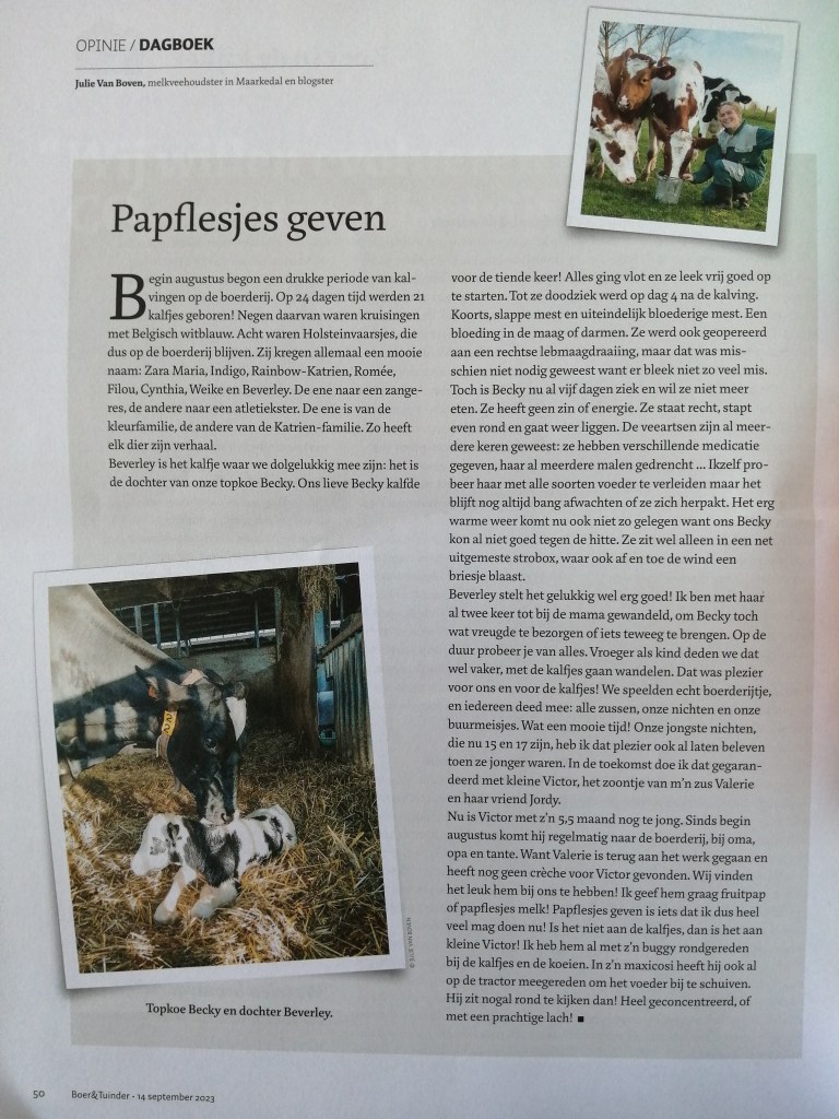 Op 14 september 2023 verscheen er een nieuw “verhaaltje” van me in Boer&Tuinder. Ik hoorde onlangs dat sommige mensen m’n dagboeken “verhaaltjes” noemen en dat ze ze zelfs bijhouden! Wel leuk om te horen! Het was dit keer een verhaal over papflesjes geven, aan kalfjes én aan een baby! Over goeie en minder goeie momenten. UPDATE: Het vervolg lees je in Harde tijden.
