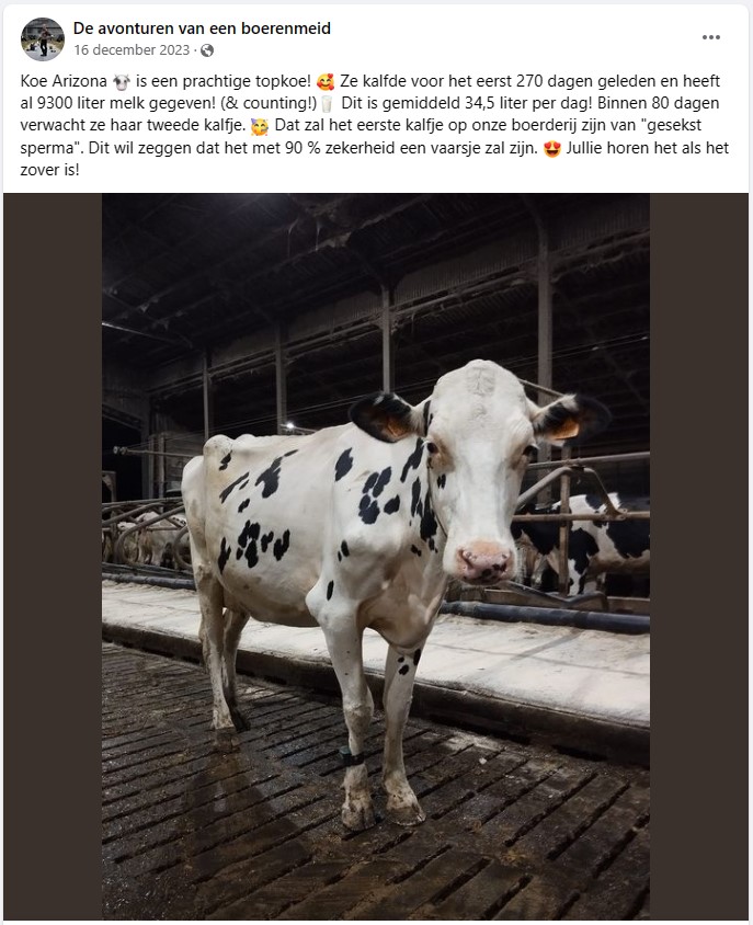 Koe Arizona was de eerste koe waarbij m’n inseminatie met gesekst sperma wel meteen lukte. Haar eerste vaarsje was Tennessee en omdat dat dochtertje zo prachtig was en omdat Arizona het zelf ook zo goed deed, wou ik terug een vaarsje van haar. Hieronder zie je een foto van haar met de uitleg die ik afgelopen december deelde op Facebook.