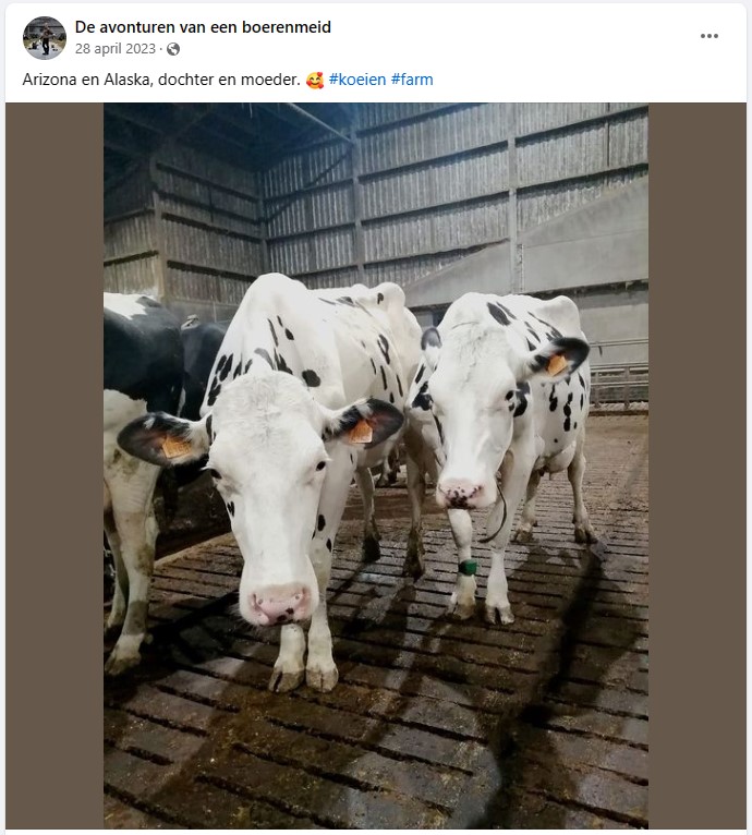 Koe Arizona was de eerste koe waarbij m’n inseminatie met gesekst sperma wel meteen lukte. Haar eerste vaarsje was Tennessee en omdat dat dochtertje zo prachtig was en omdat Arizona het zelf ook zo goed deed, wou ik terug een vaarsje van haar. Hieronder zie je een foto van haar met de uitleg die ik afgelopen december deelde op Facebook.