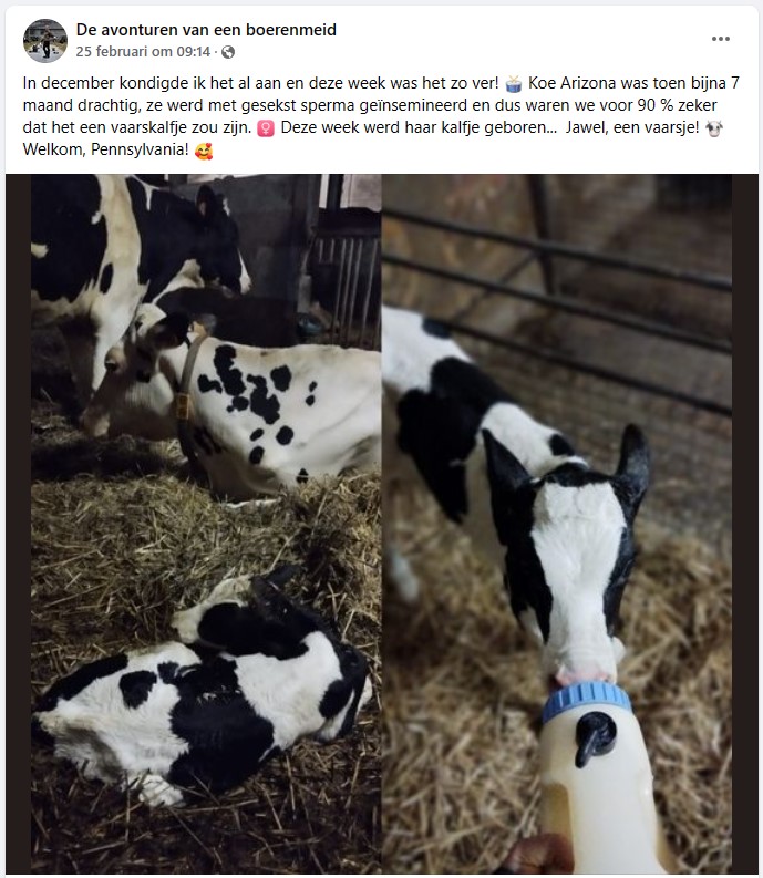 Op 22 februari 2024 was het dan zover, koe Arizona kalfde! Het werd inderdaad een vaarsje! Want je wist maar nooit dat die eerste net bij die 10 % ging zitten. Het werd een heel mooi meisje, dat ik de naam Pennsylvania gaf. Niet veel later, op 3 maart, werd het tweede kalfje van gesekst sperma trouwens ook geboren. Koe Carrie kalfde van dochtertje Chrissy. Carrie had al twee stiertjes gekregen en dat moest nu anders! In haar tweede lactatie was ze namelijk goed voor een prachtige 11 000 liter melk! Binnenkort zien jullie Pennsylvania en Chrissy wel eens samen online verschijnen!
