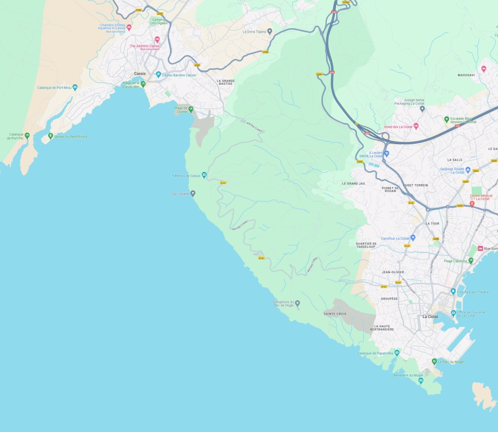 Op de derde kaart is deze autoweg duidelijk te zien. De Route des Crêtes (D141) is een goeie 10 km lang en gelegen tussen de steden Cassis en La Ciotat. Langs deze kronkelende weg vind je verschillende parkeerplaatsen, vanwaar je prachtige uitzichten hebt. Soms moet je ook even wandelen om tot een uitkijkpunt te komen. Maar het is meer dan de moeite waard om eventjes omhoog te stappen!