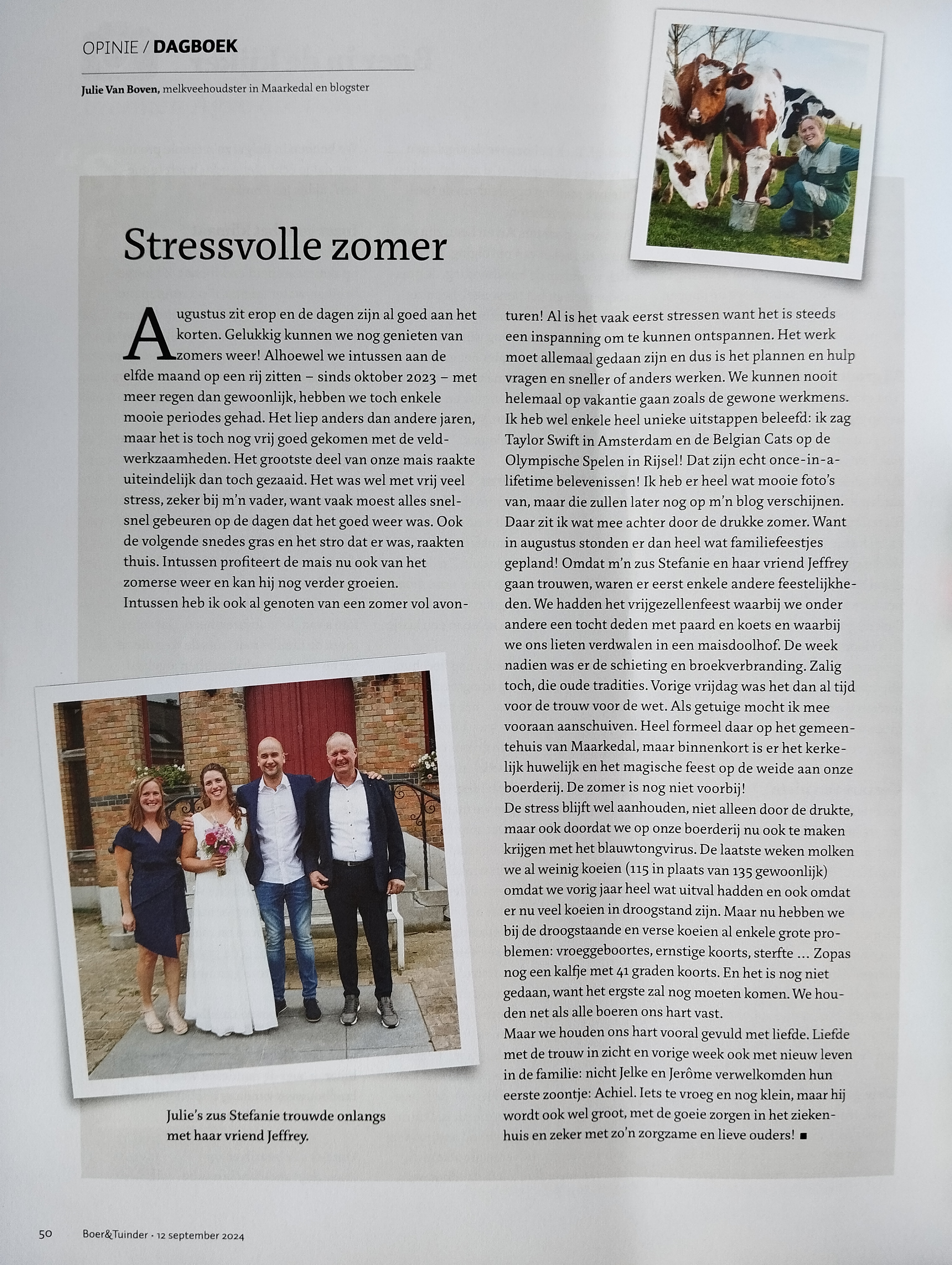 Op 12 september stond er opnieuw een dagboek van me in Boer&Tuinder. Vorige keer vertelde ik dat m’n zus me had gevraagd om getuige te zijn op haar huwelijk – lees het op Lichtpunten tijdens het regenachtige voorjaar – nu was het zover! Het zorgde wel voor redelijk wat stress, vooral in combinatie met de boerderij en allerlei andere activiteiten. Hieronder zie je een foto van hoe het dagboek gepubliceerd werd, verder krijg je ook m’n geschreven tekst voluit.