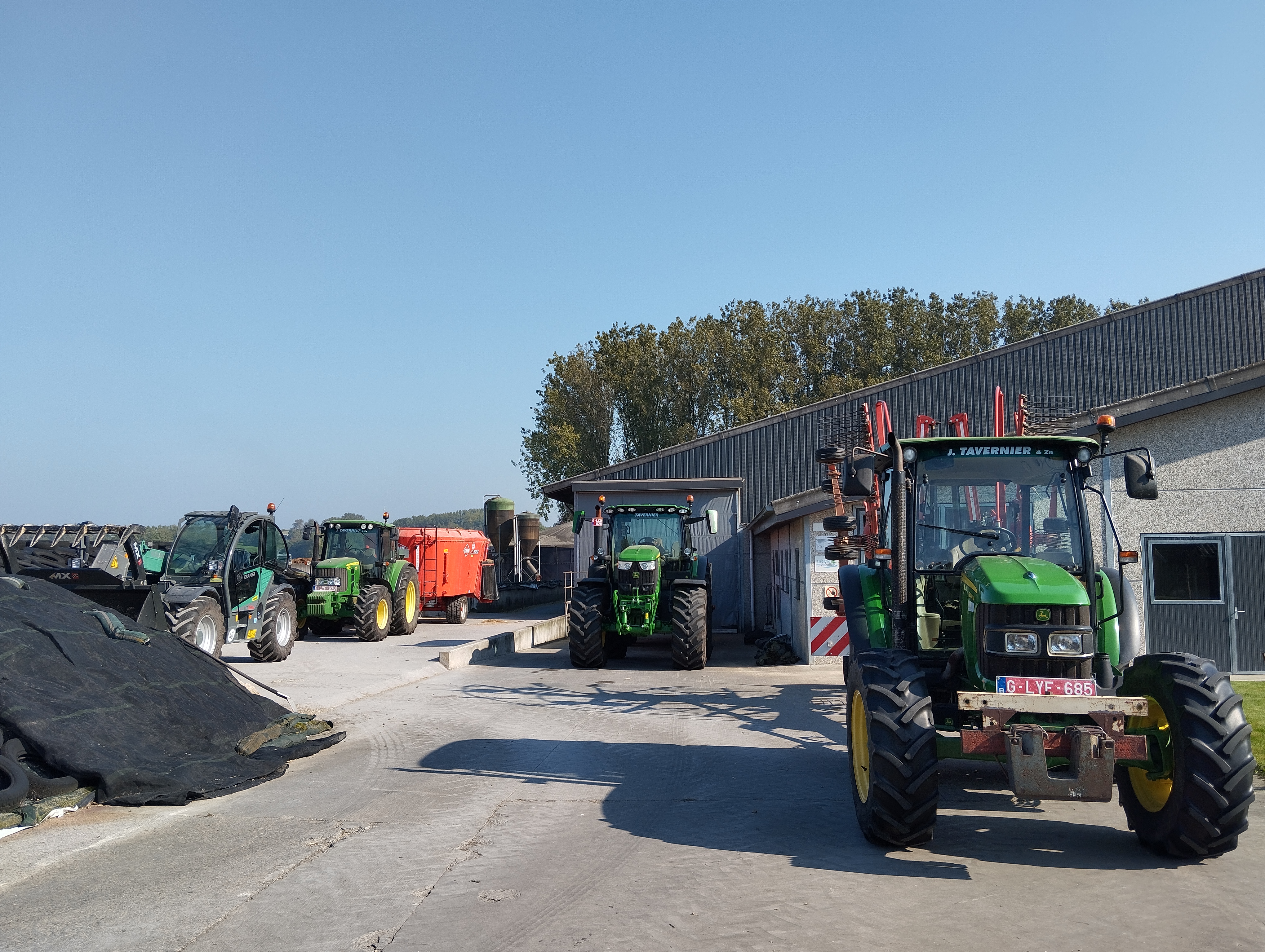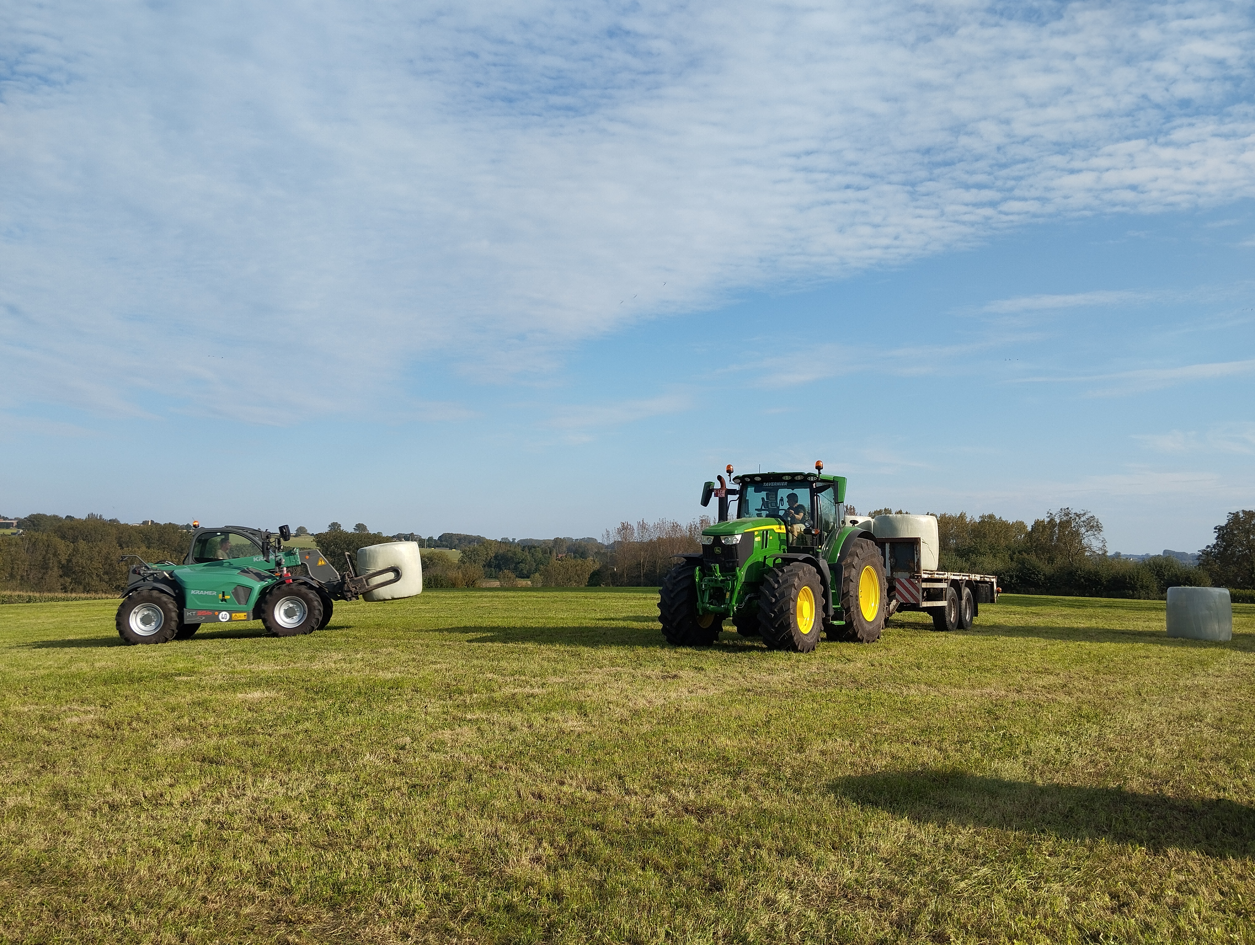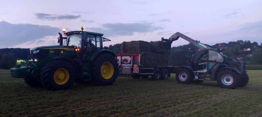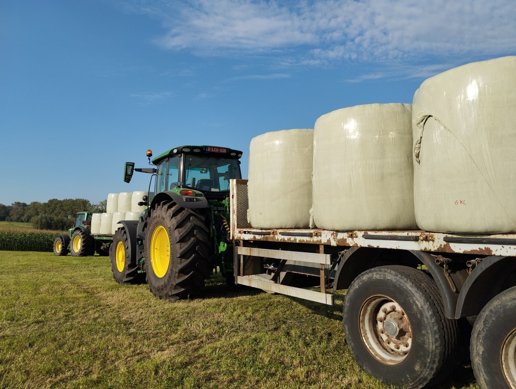 De laatste snede gras was voor het nazomertje van september, waar we nog eens 23 tot 25 °C kregen. Een hittegolf zoals vorig jaar in september 2023 kregen we niet, maar dat hoeft ook niet! Ik kon enkele heel mooie foto’s nemen met een prachtige zon, mooie landschappen en flinke tractoren. 0p de derde foto zie je hoe ik met de verreiker en tractor voeder aan het laden en mengen was, terwijl er rechts twee tractoren klaar staan om in het gras te werken. De eerste rechts vooraan met de hark, de middelste met een kar om de pakken te gaan halen. Nu waren het trouwens geen pakken maar bollen. Deze werden meteen gewikkeld op het land. Loonwerken Gheenens heeft een nieuwe machine die dit mogelijk maakt! We hebben de bollen dan met een klem op de verreiker geladen en voorzichtig op de karren gezet. Al het gras van 2024 was nu thuis!
