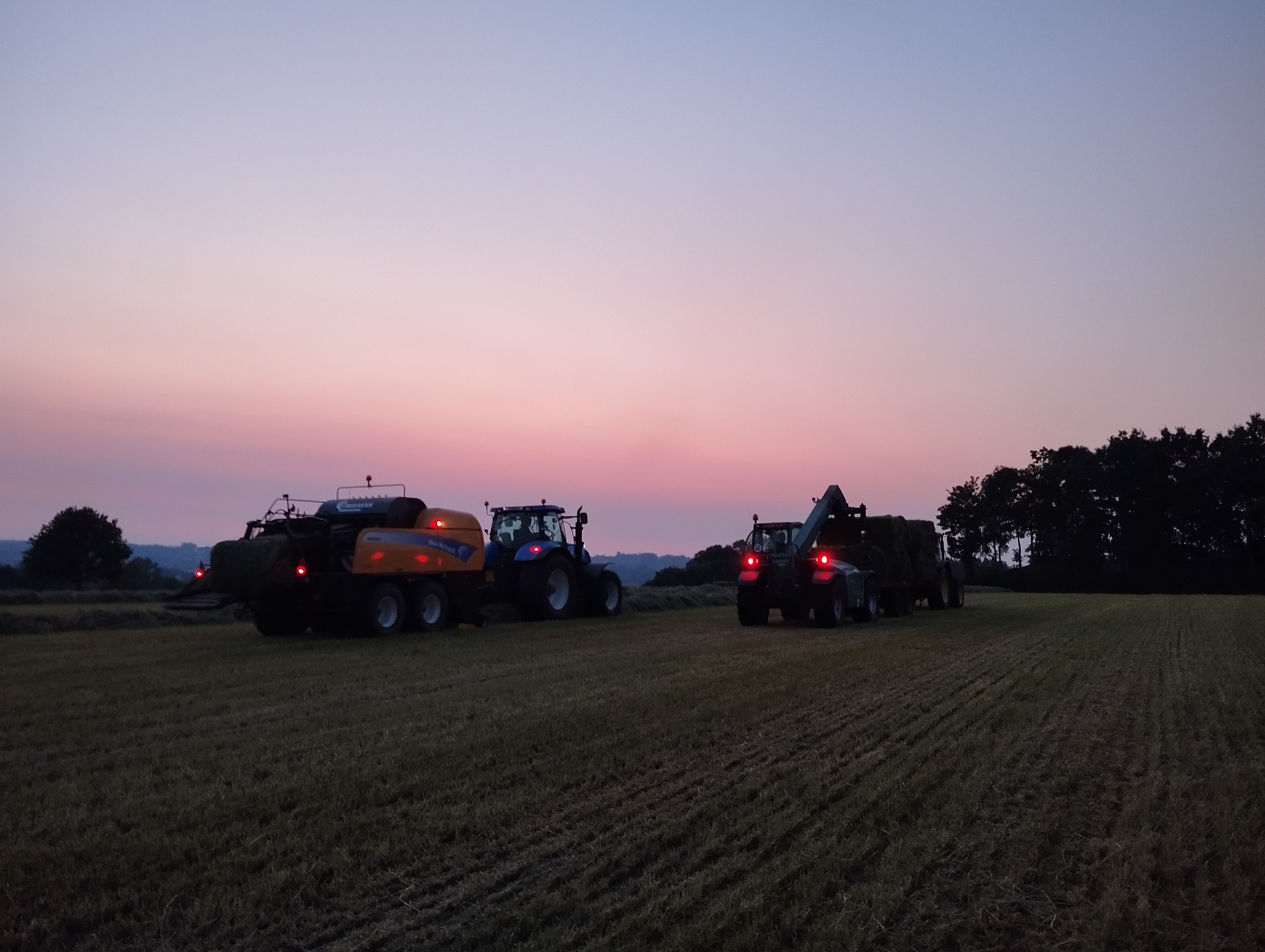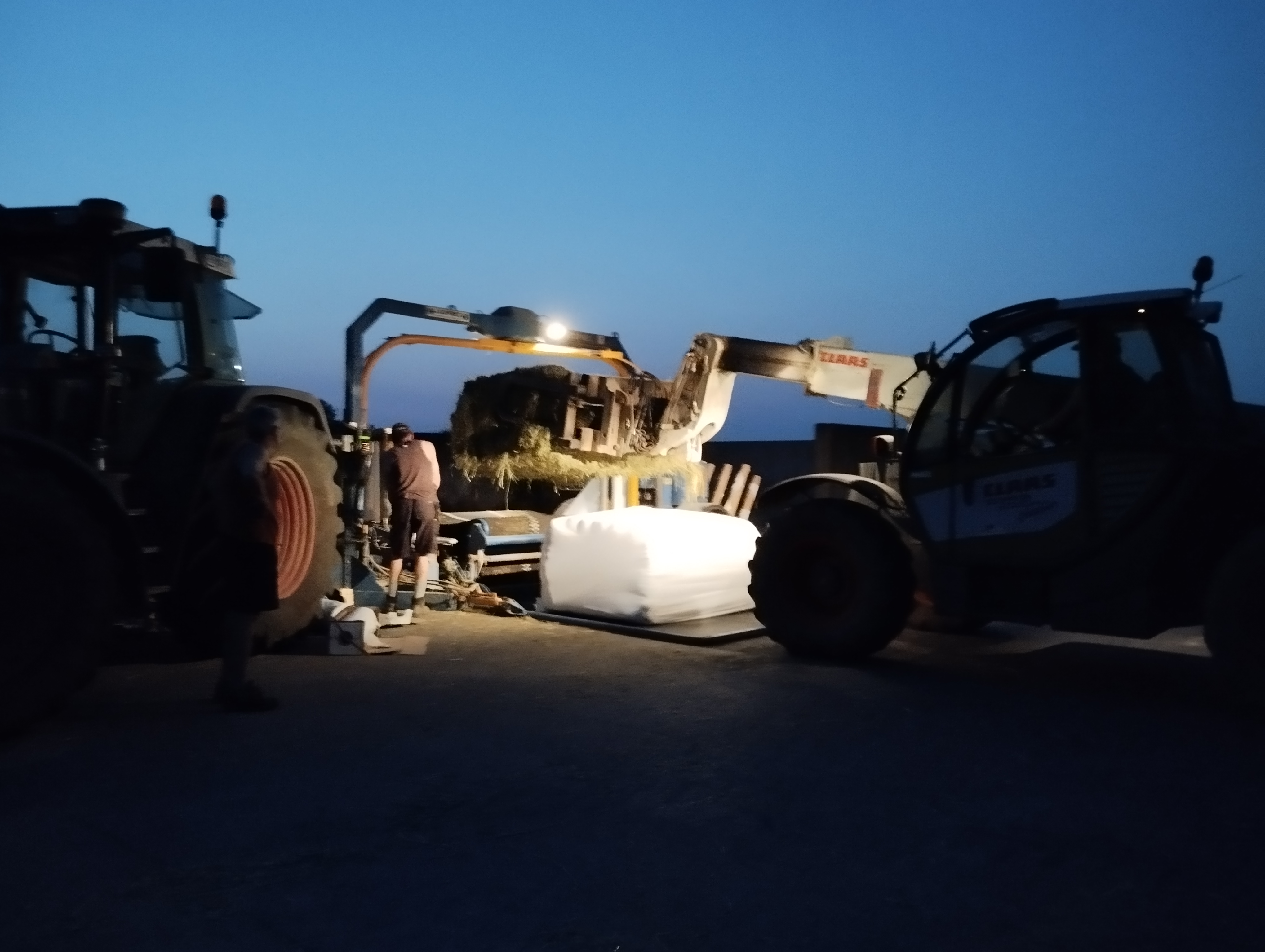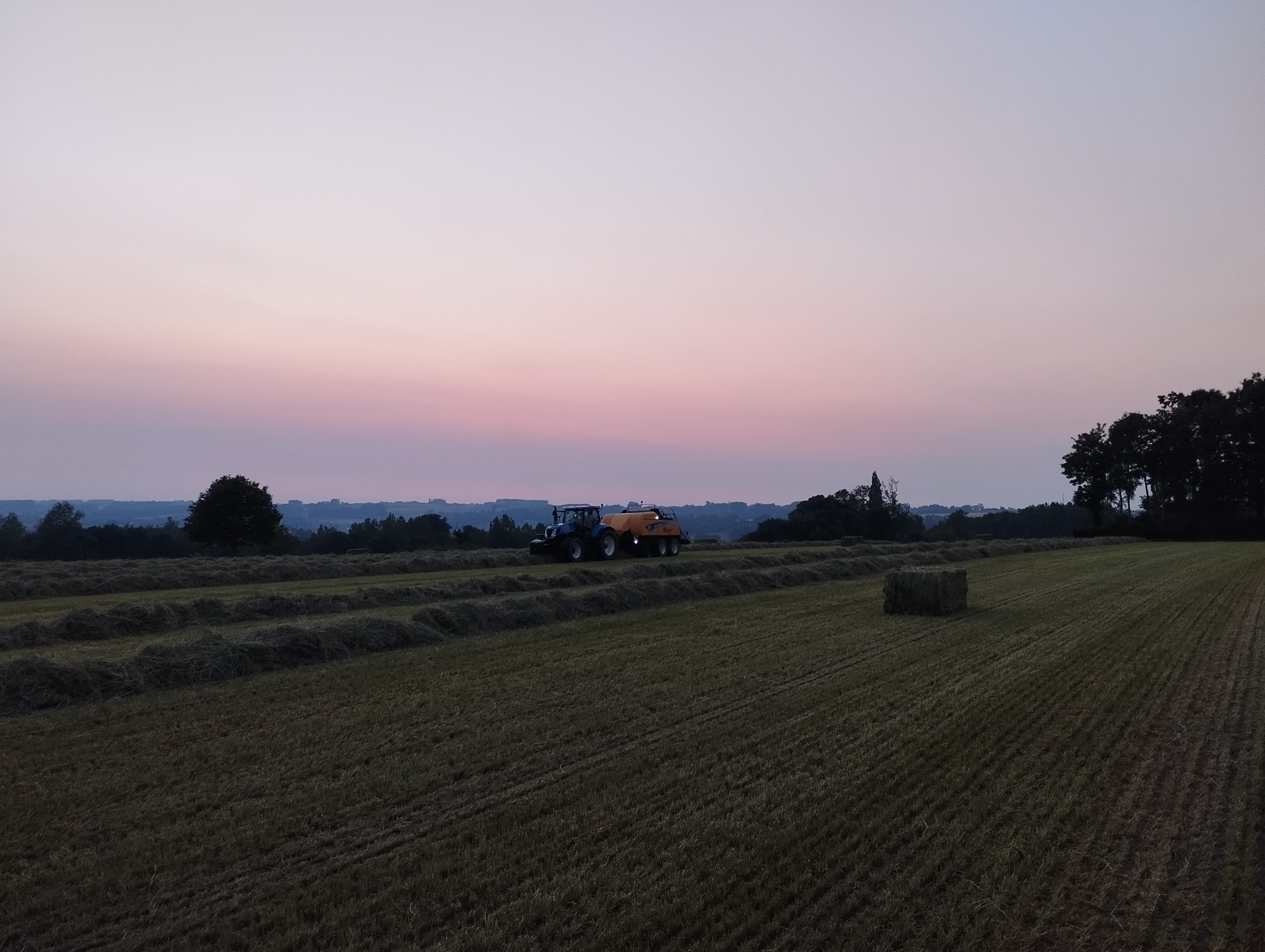 De laatste snede gras was voor het nazomertje van september, waar we nog eens 23 tot 25 °C kregen. Een hittegolf zoals vorig jaar in september 2023 kregen we niet, maar dat hoeft ook niet! Ik kon enkele heel mooie foto’s nemen met een prachtige zon, mooie landschappen en flinke tractoren. 0p de derde foto zie je hoe ik met de verreiker en tractor voeder aan het laden en mengen was, terwijl er rechts twee tractoren klaar staan om in het gras te werken. De eerste rechts vooraan met de hark, de middelste met een kar om de pakken te gaan halen. Nu waren het trouwens geen pakken maar bollen. Deze werden meteen gewikkeld op het land. Loonwerken Gheenens heeft een nieuwe machine die dit mogelijk maakt! We hebben de bollen dan met een klem op de verreiker geladen en voorzichtig op de karren gezet. Al het gras van 2024 was nu thuis!