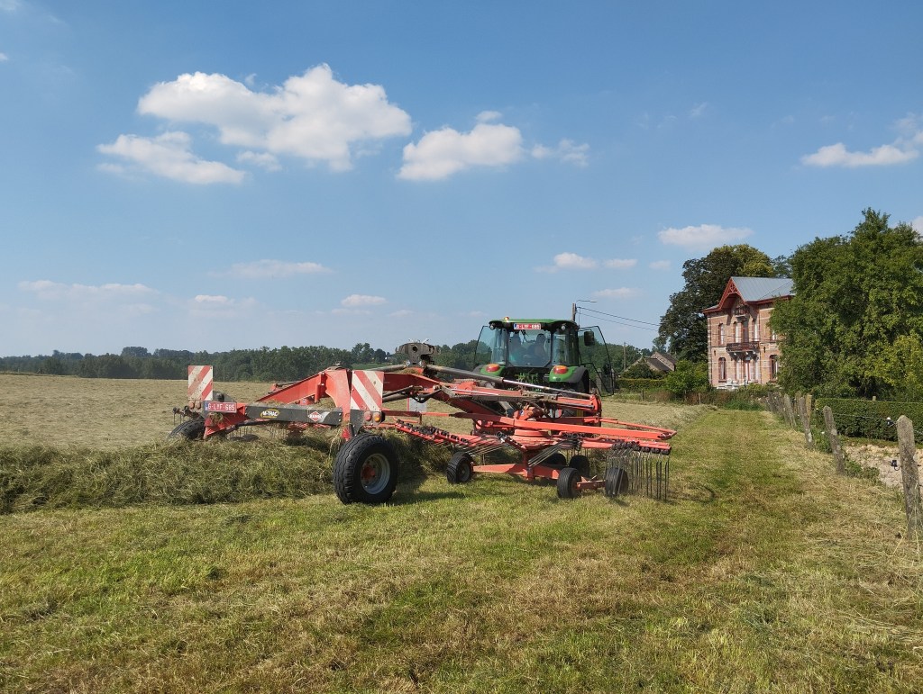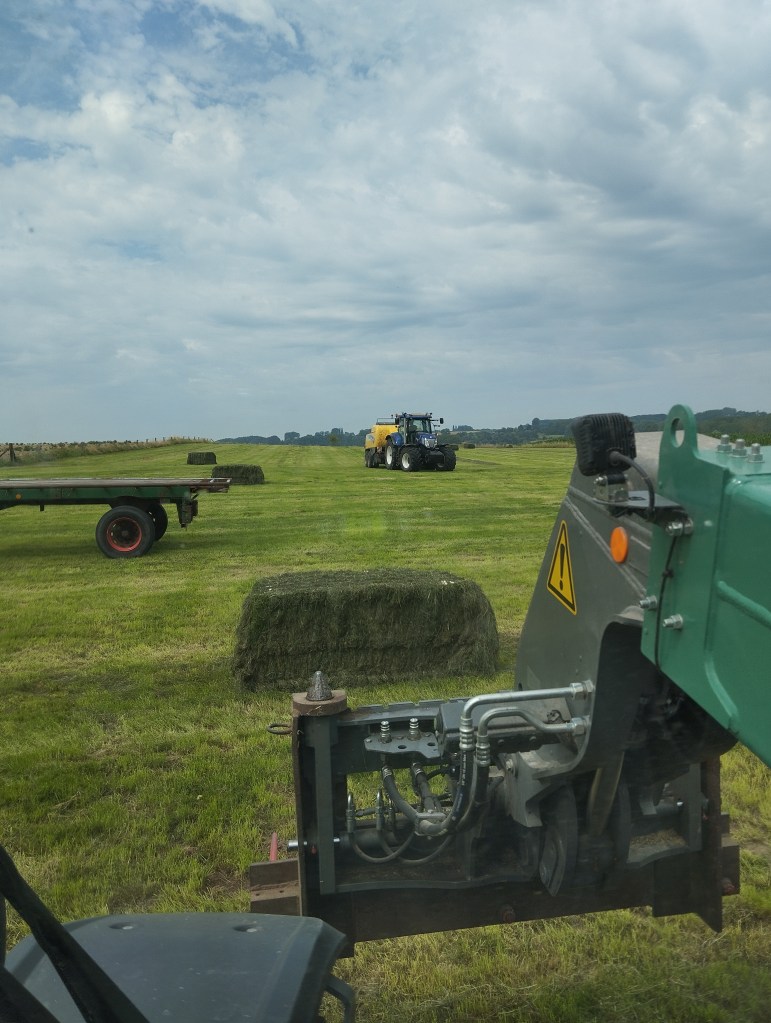 Het was een lange en hete dag, die 26e juni van 2024! Want nadat de graskuil gedekt was ’s ochtends vroeg, werd er verder gedaan aan het andere gras. Op de eerste foto zien we Jeffrey het gras harken op de weide aan ons hof. Het kasteel Grootveld is hier prachtig te zien, een van de bekendste gebouwen in ons prachtige Schorisse. ’s Avonds werd het gras tot pakken geperst door loonwerken Gheenens en dan door ons naar huis gehaald. Op onze boerderij werden de pakken dan gewikkeld en gestapeld door loonwerken Vantieghem.
