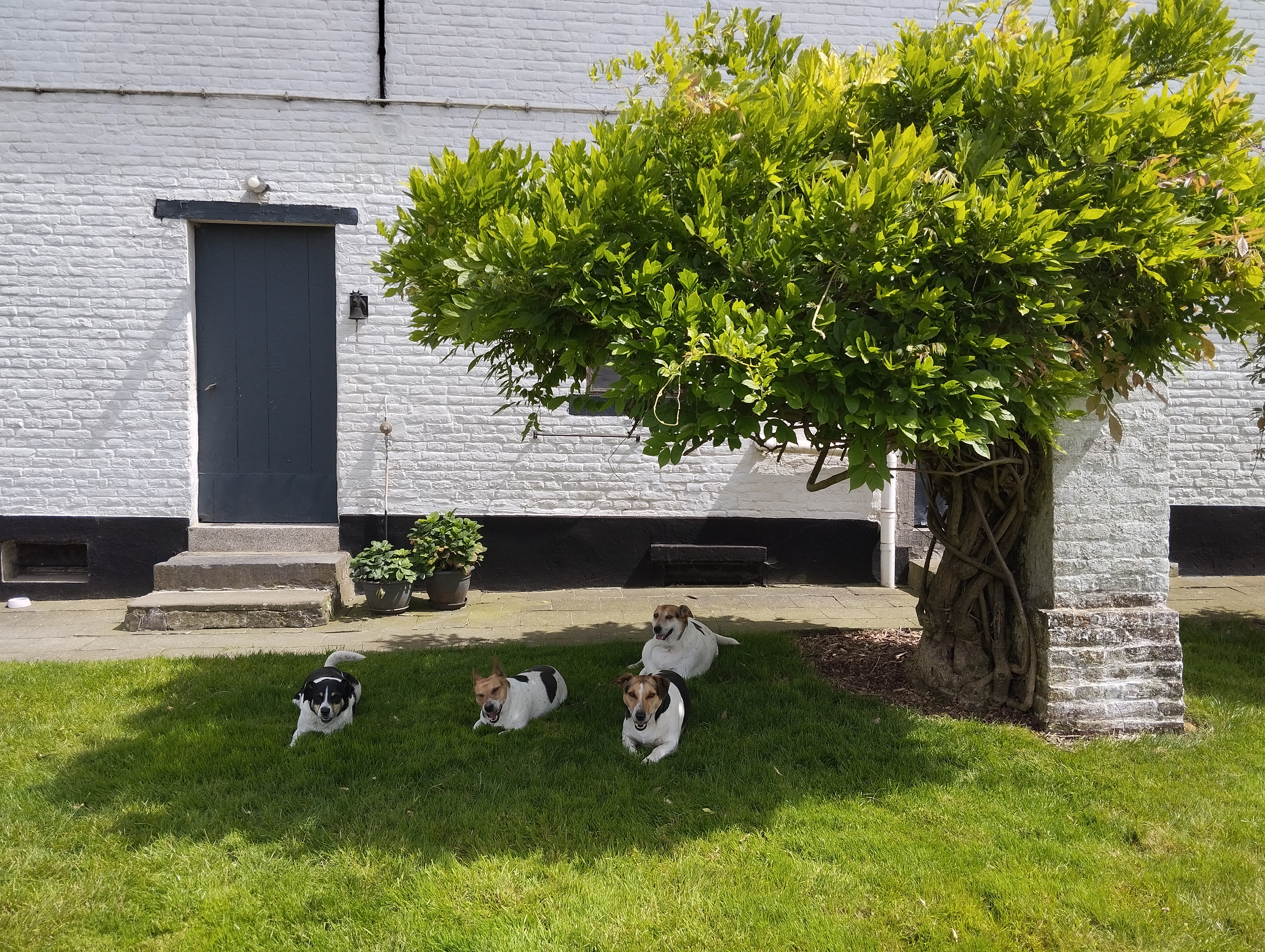 Er werd altijd in delen gewerkt: eens een dag maaien, een dag oprapen, terug een dag maaien, terug een dag pakken maken en naar huis halen… Zo konden alle hectaren gras afgewerkt worden op zaterdag 29 juni 2024. Het werd intussen al een hele hoop pakken! Maar voordeel is dat ze kunnen blijven staan tot we ze nodig hebben. Is het dit jaar niet meer, dan volgend jaar. We dekken ze wel nog af met een net want anders komen de kraaien er in pikken. Een mooie foto van ons huis én van onze honden die schuilen voor de hete zon onder de blauwe regen boom kan ik jullie niet weerhouden.