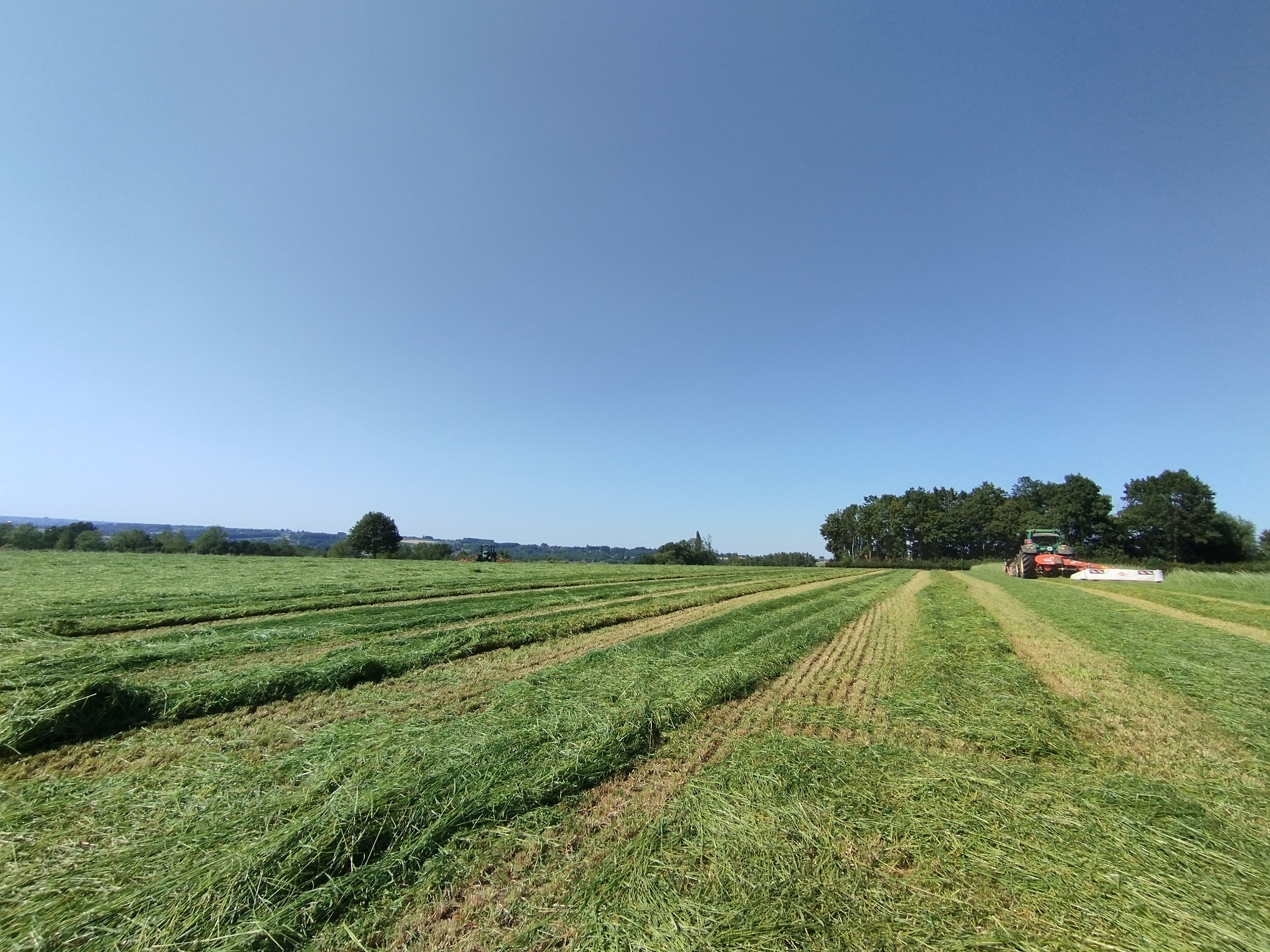 Het eerste deel van de derde snede gras was aan de beurt eind juli. We kregen opnieuw enkele zomerse dagen met temperaturen van 28 tot 31 °C! Maaien (rechts) en schudden (ver links achteraan) zie je op de eerste foto. Twee dagen later pakken ophalen zie je op de tweede foto. Net op tijd gedaan want ik ging de dag nadien naar de Belgian Cats op de Olympische Spelen!