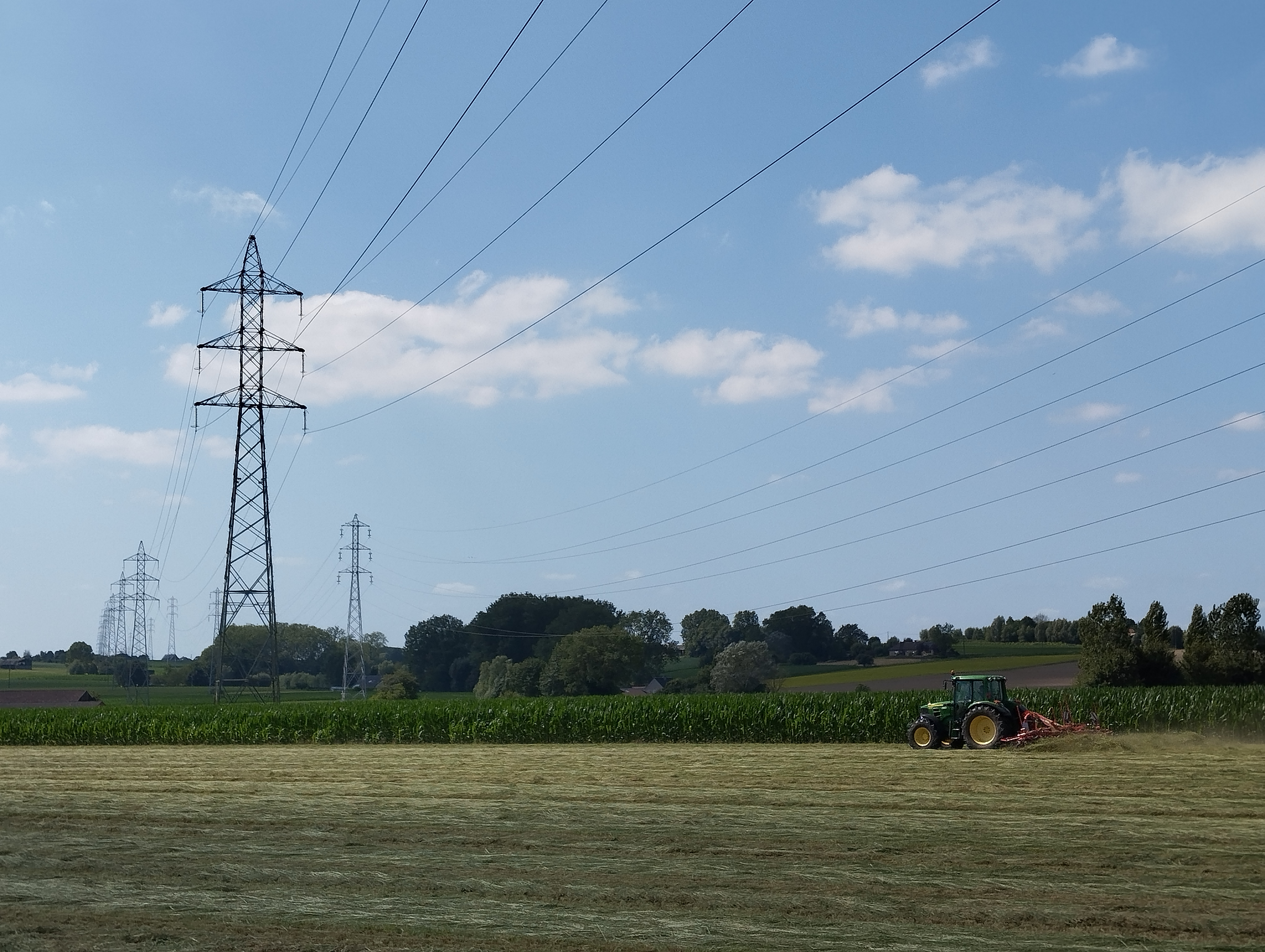 Het tweede deel van de derde snede gras was voor de week nadien. Op de eerste foto zorgen de elektriciteitskabels voor een leuk effect. Deze foto is genomen in Oudenaarde, op land dat we wisselen om zo vruchtafwisseling te hebben. Het werd wel nachtwerk om de pakken gras naar huis te halen! Aangezien ze regen gaven deden we ’s nachts verder tot een uur of 3! Zus Sofie nam een mooie foto, zij reed mee met haar vriend Matthias, die chauffeur was van de tractor. Ik ben aan het werk met de verreiker.