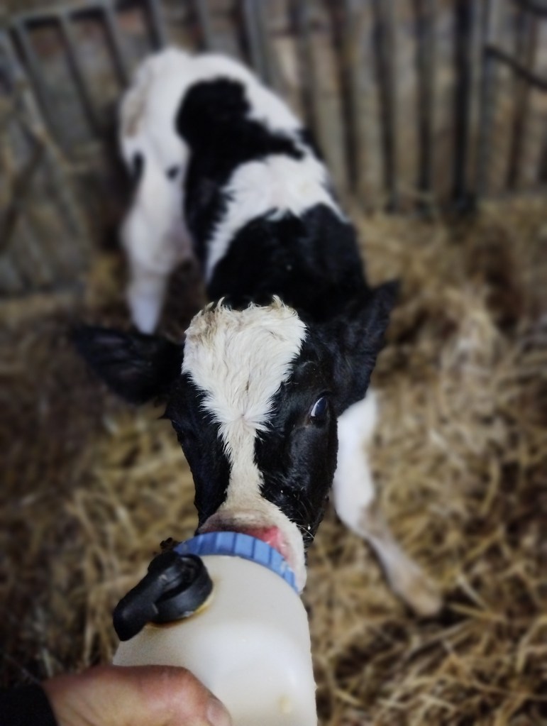 Nu is het tijd voor de foto’s van Werelddierendag 2024! De eerste verscheen dus ook op m’n Facebookpagina. Er werd die ochtend een vaarskalfje geboren, van koe Talisa, en ik ben ze met de papfles melk aan het geven. Ik vroeg online ook naar een naam en voegde twee ideeën samen om te komen tot: Tammie.