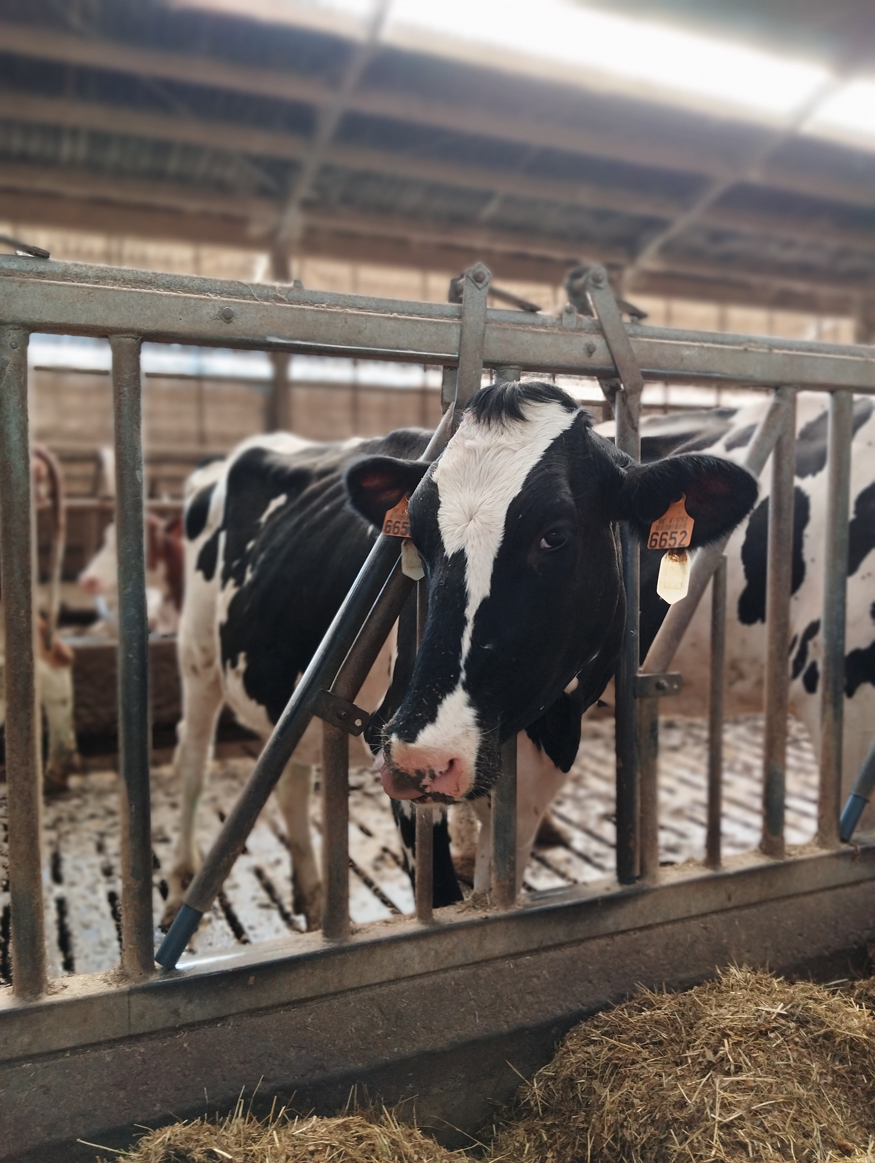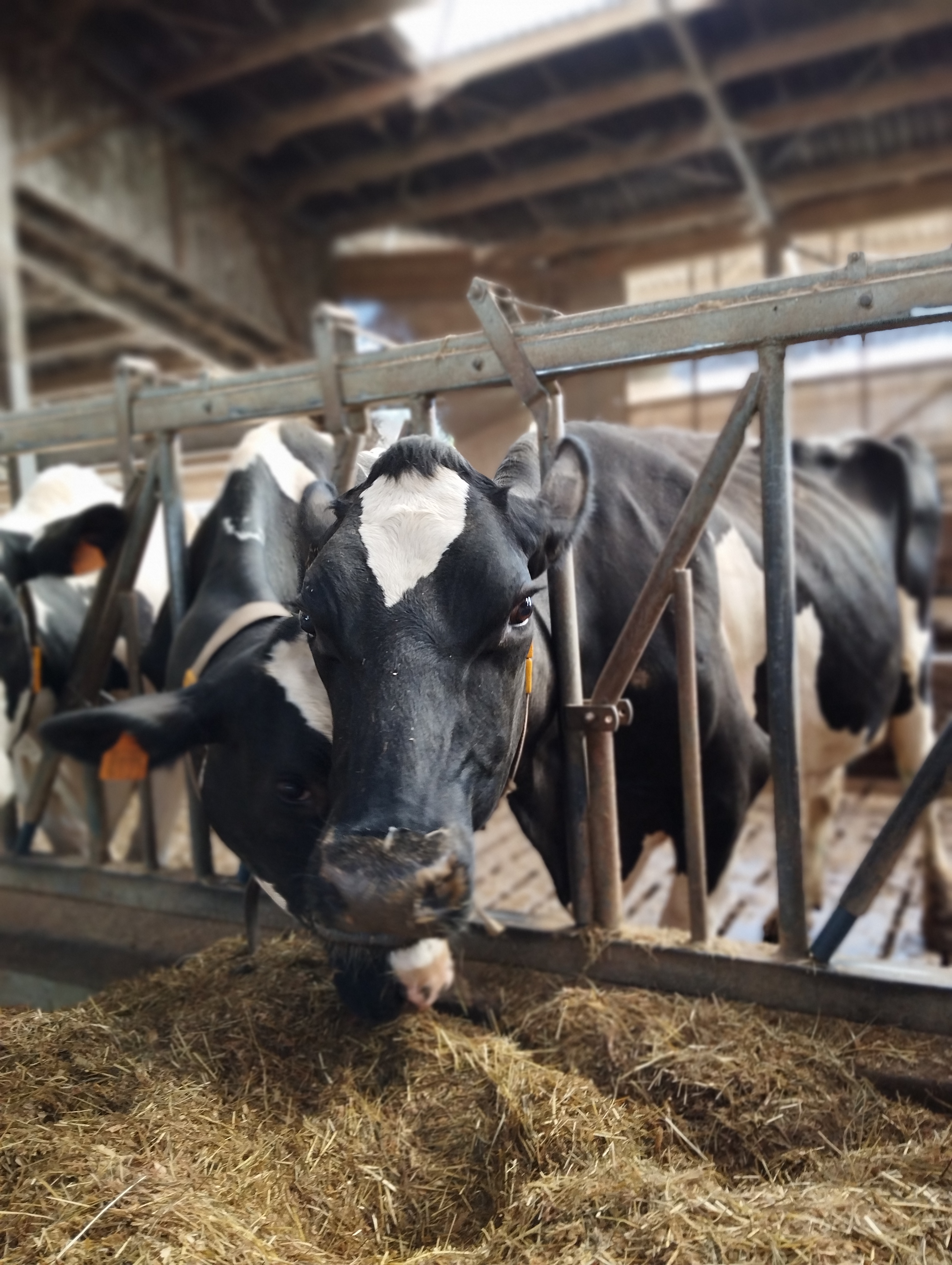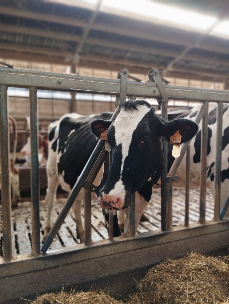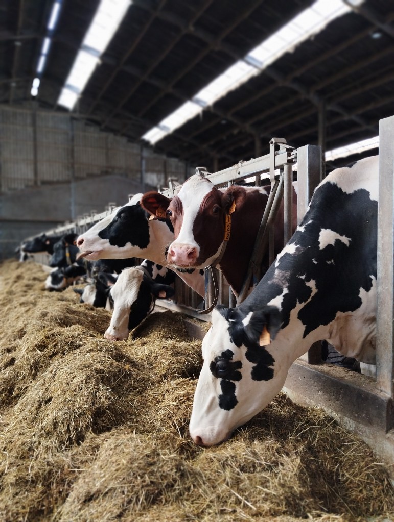 Onderstaande foto vind ik een hele mooie foto van onze koeien aan het voederhek. We zien koeien Pilar, Daisy, Janneke en Sierre. De rood-witte Janneke is deel van een tweeling, waarover ik eerder schreef op m’n blog: in Twin sisters (28-6-2021) was ze net geboren en later was er de update Tweelingzussen op de boerderij (19-1-2023).